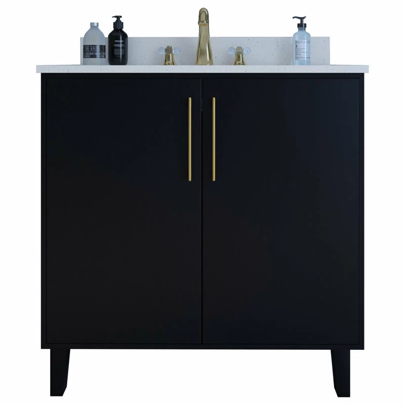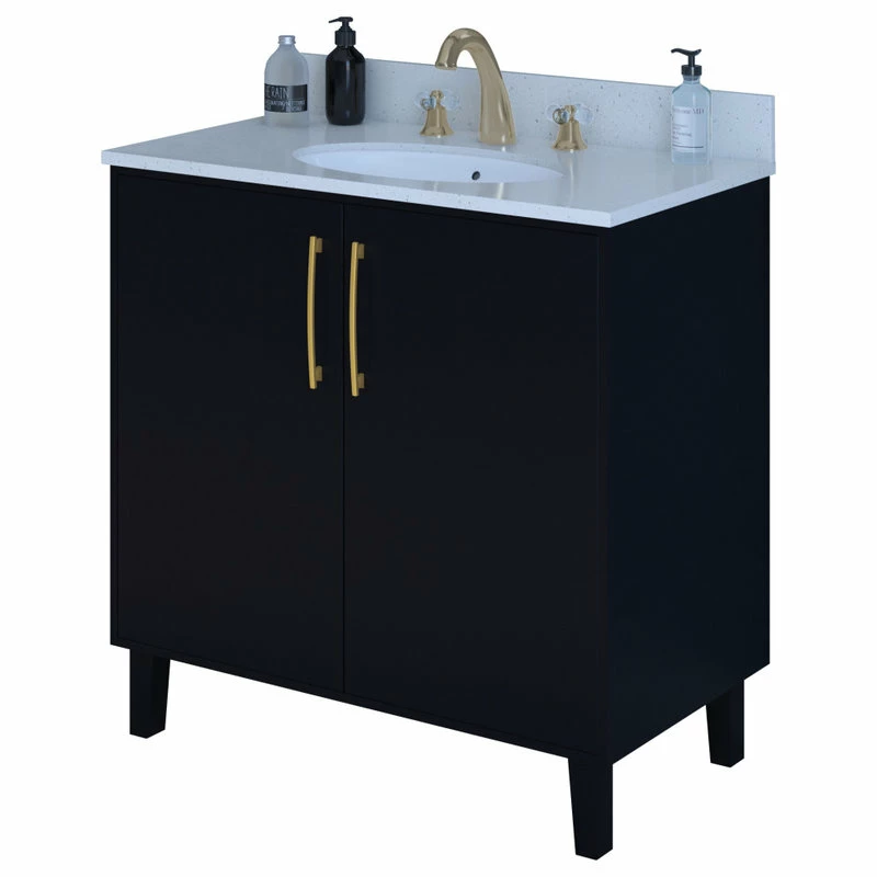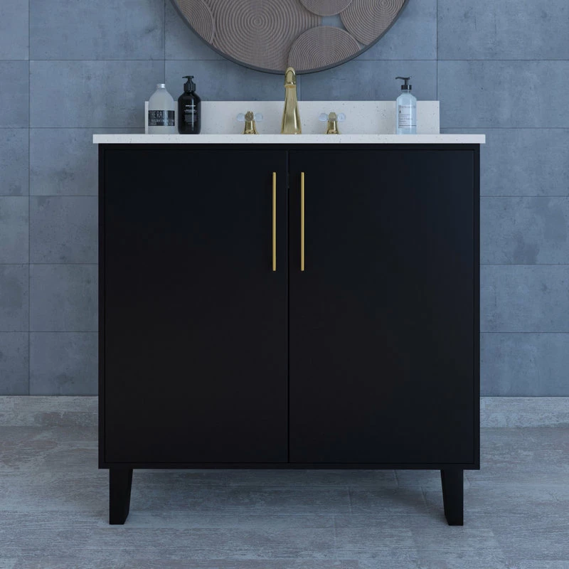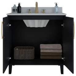 Clean lines and long vertical pulls give this black 36 inch bathroom vanity modern appeal. The large open cabinet features soft-close hinges and plenty of space to store towels, toiletries, and other bathroom essentials. Finish it with the faucet of your choice to create your ideal look.