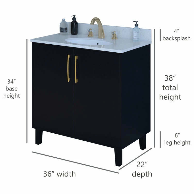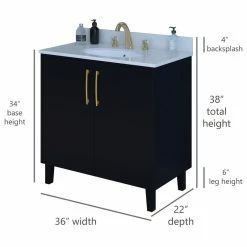 The MDF base cabinet on this bathroom vanity measures 36″ wide, 22″ deep, and 34″ tall. With its 4″ backsplash, it stands 38″ high overall. The oval sink measures 19″ x 13.5″ and is 10″ high.