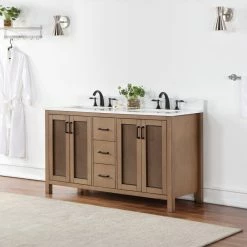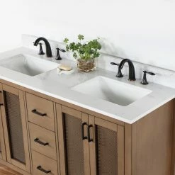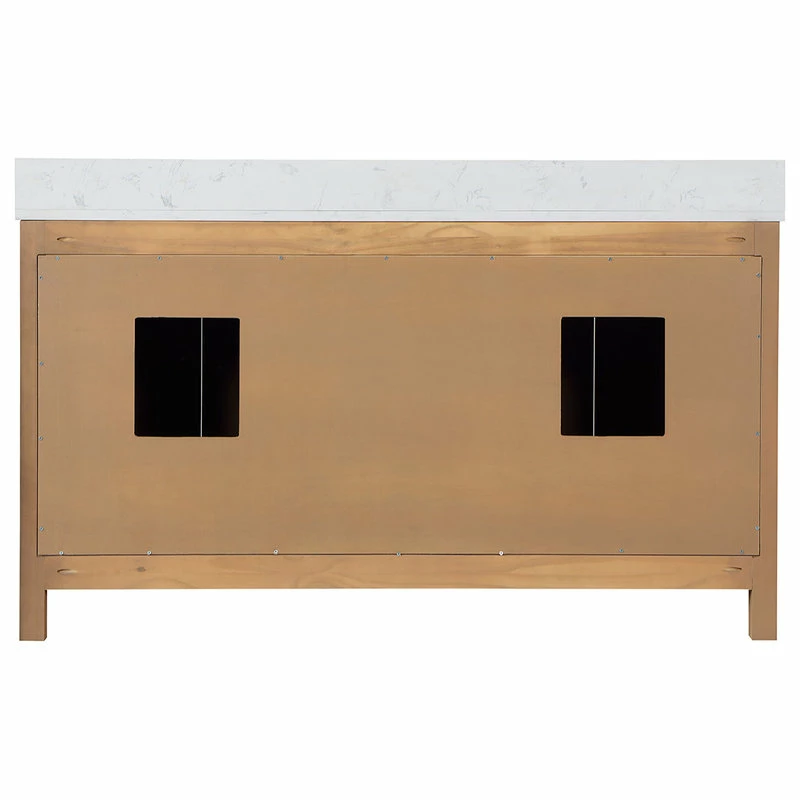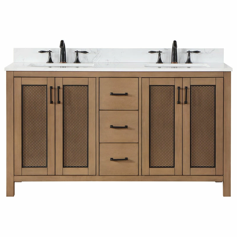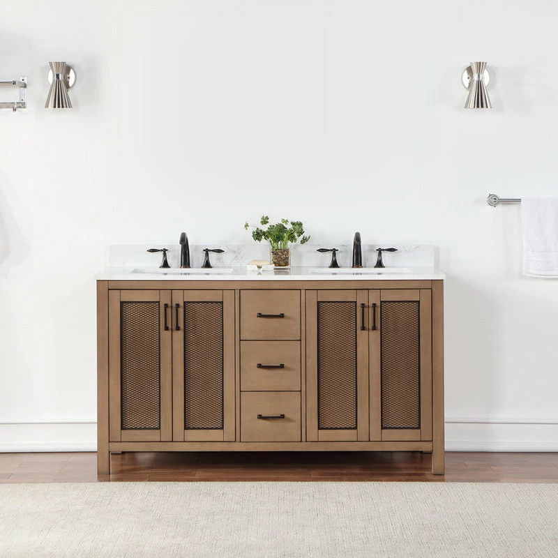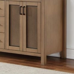 With its compelling blend of wood, metal, and stone, our Hadiya Vanity has an industrial style edge. Metal mesh inserts on the cabinet doors lend a dash of bold texture, concealing spacious storage for stowing away towels, cleaning supplies, and toiletries. Soft-closing drawers provide additional storage flexibility to help keep your space tidy. This sturdy and well-constructed vanity is capped with a beautiful, easy-to-clean composite-stone countertop that provides a stunning parallel with the natural wood grain.