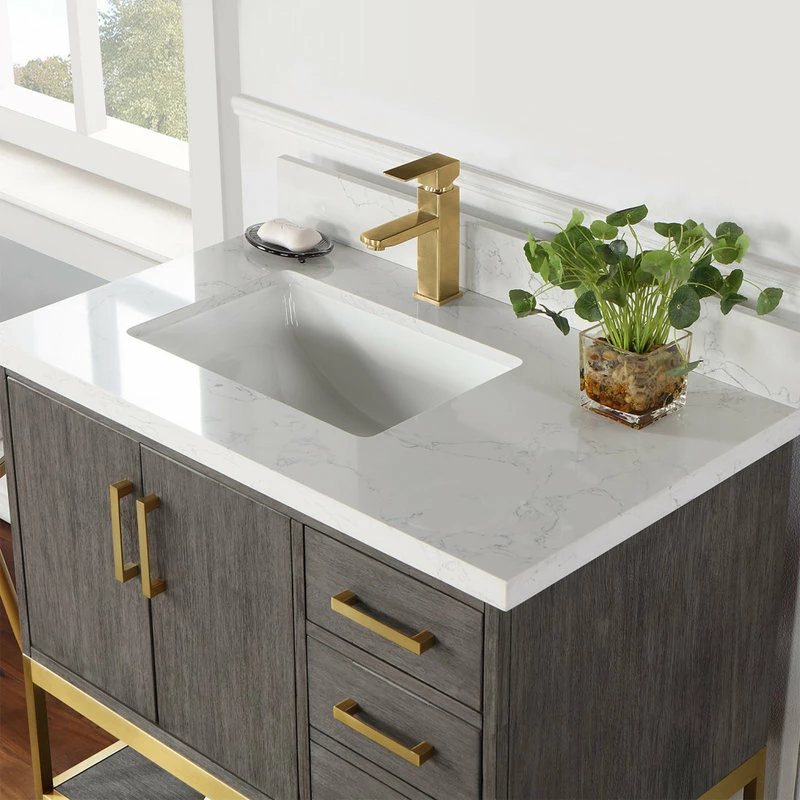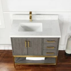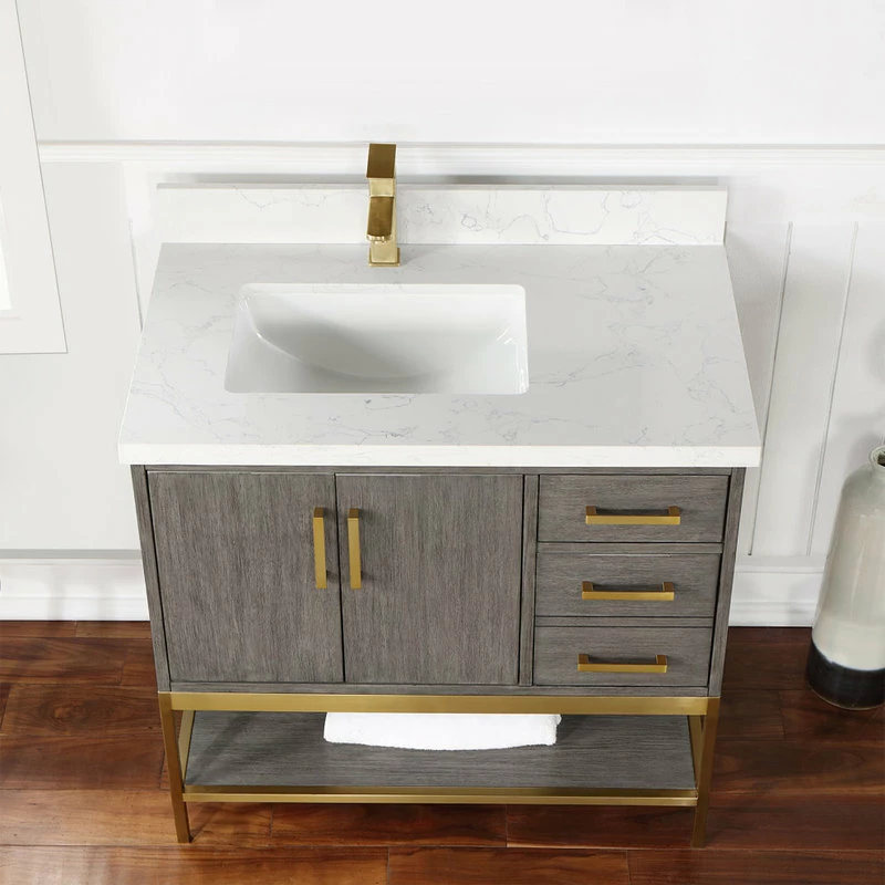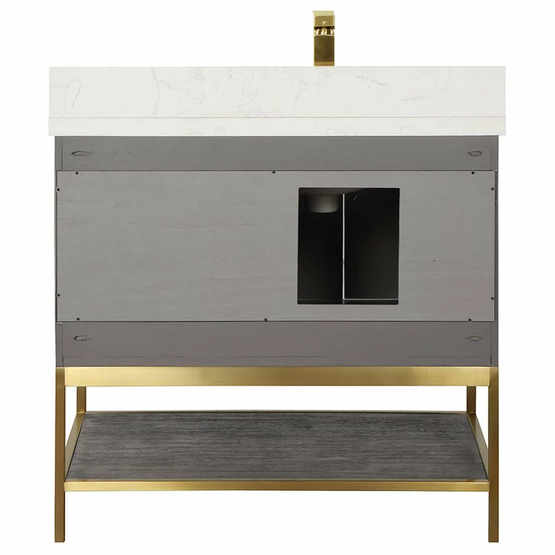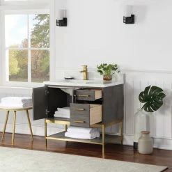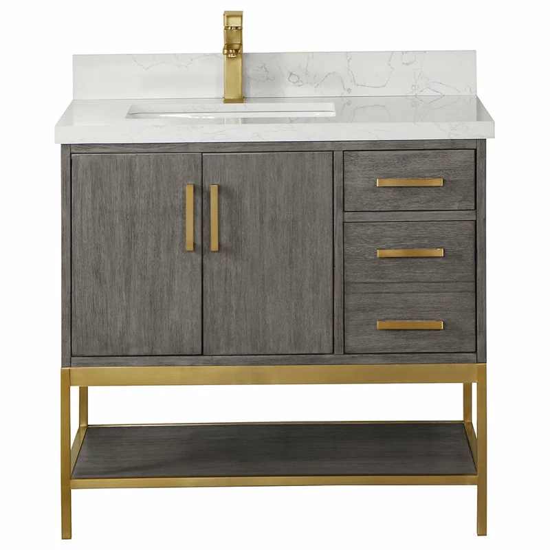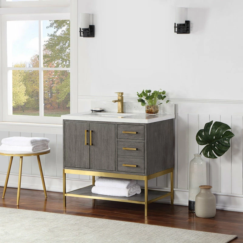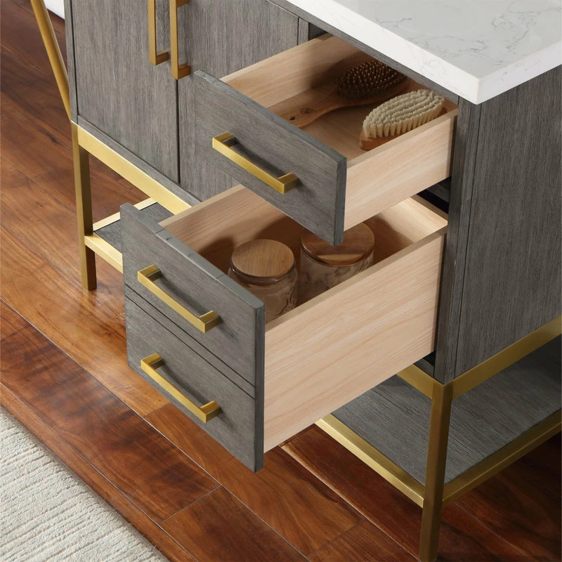 Looking to add style and warmth to your bathroom space? Featuring an exciting blend of textures and storage options, our Wildy Vanity Series embodies a fresh, modern aesthetic with an industrial edge. This piece doesn’t skimp on space, with a roomy main cabinet and full-extension, soft-closing drawers atop an open metal frame. A bottom open shelf adds optional storage or display space for luxury towels. The cabinet is adorned with a solid composite stone countertop featuring exquisite marbling and an easy-to-clean surface.
