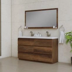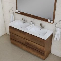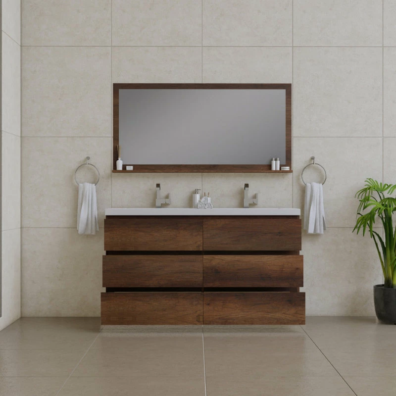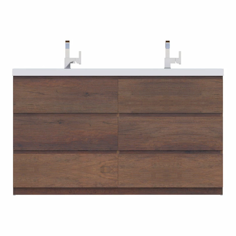Alya Bath Paterno 60 inch double bathroom vanity gives an updated modern look to any bathroom. This freestanding vanity offers great storage with a smooth soft-closing, fully functional six drawers. The white acrylic sink completes the simple contemporary design and clean lines brings a touch of modern into your bathroom.