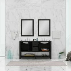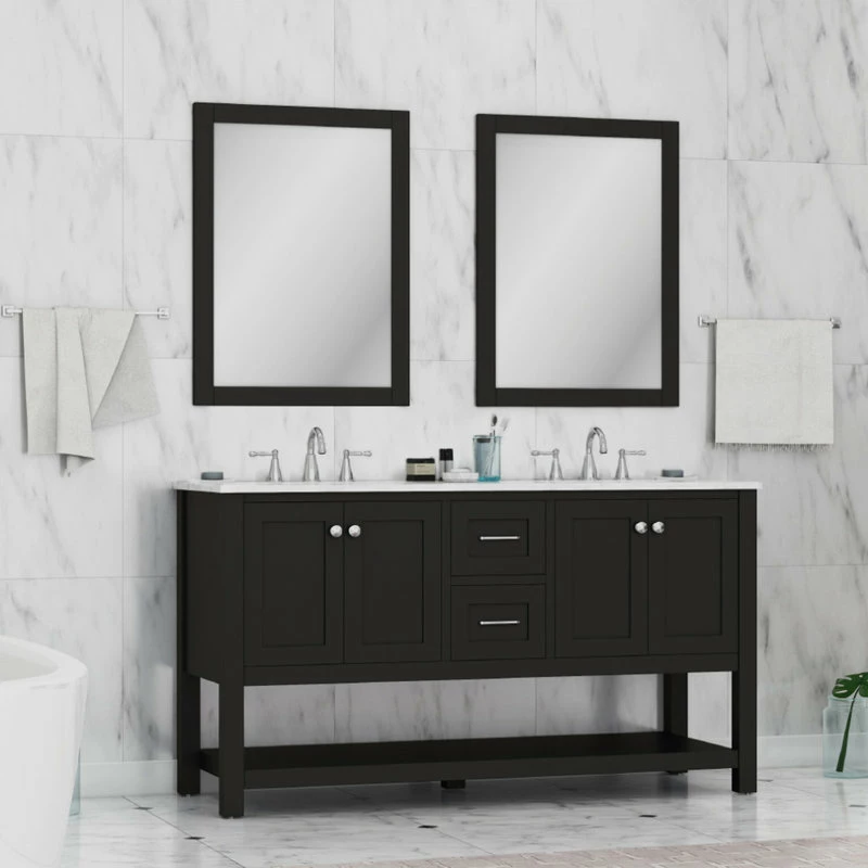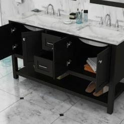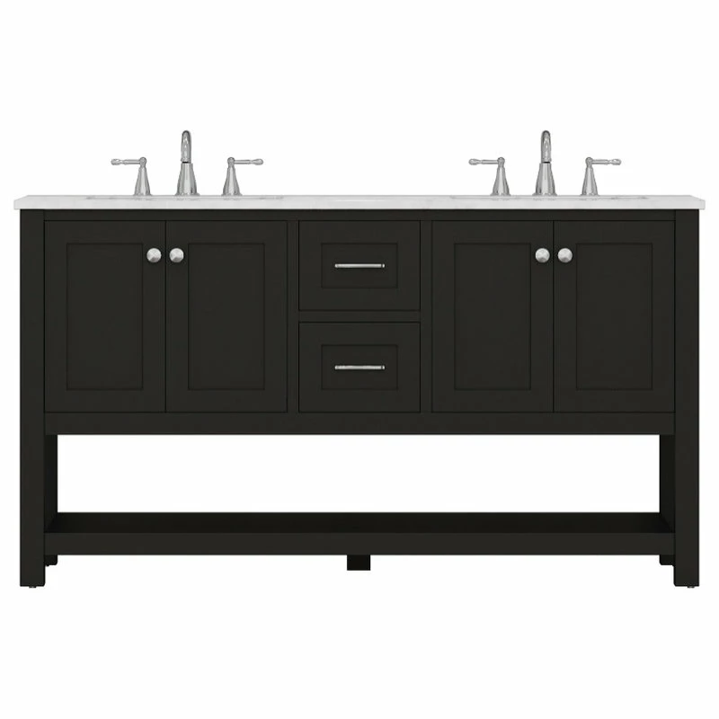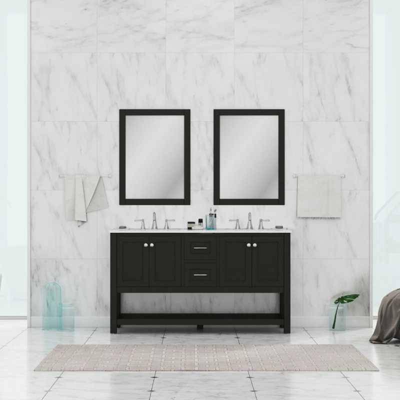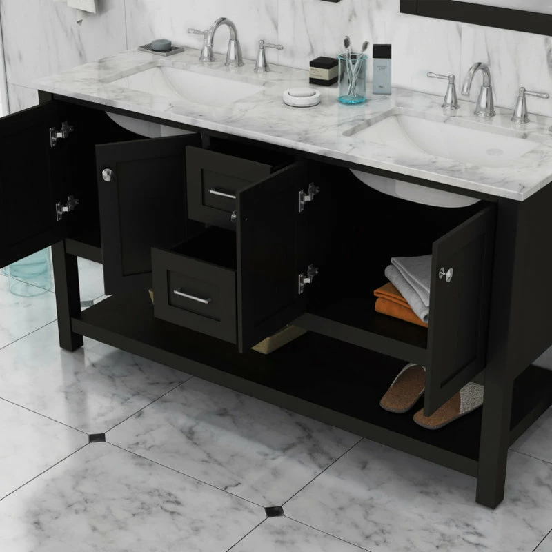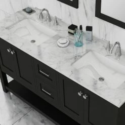 Update your en suite or Jack-and-Jill with the transitional style of the Wilmington Double Vanity. This vanity comes complete with two porcelain undermount sinks, brushed nickel hardware and ample storage space for your toiletries and linens. With top-of-the-line features like soft-closing doors/drawers and a Carrara marble top, you and your guests will experience the feel of luxury in the comfort of your own home.