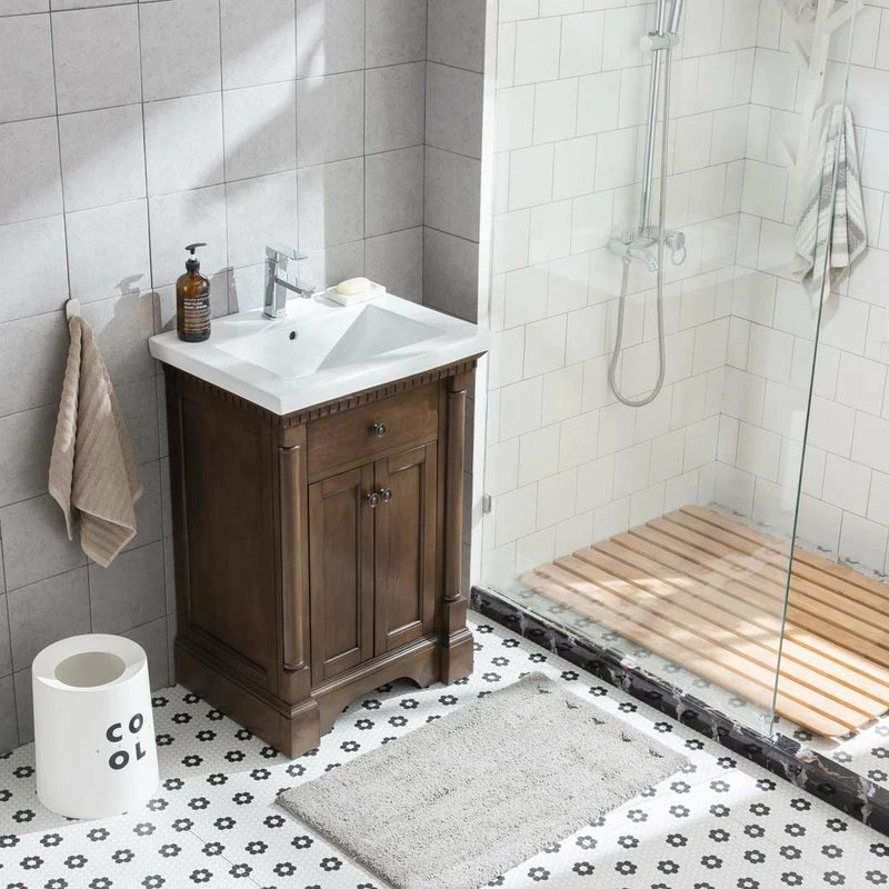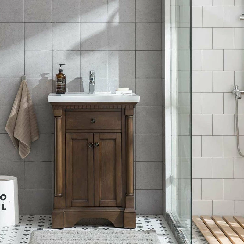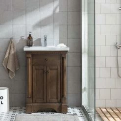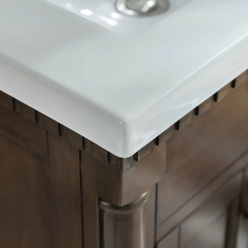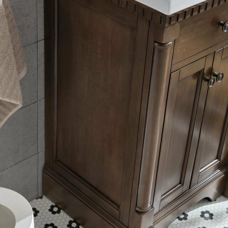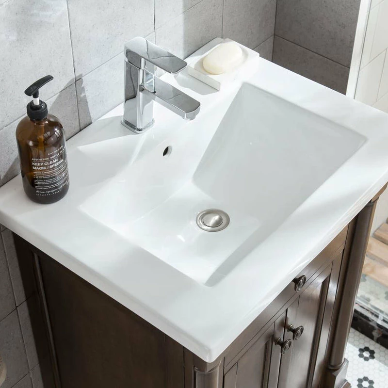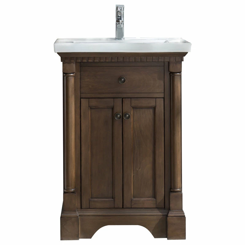 Our 24″ Stella is a traditional style bathroom vanity with beautiful detailed molding and hand finished by brush in antique coffee. Includes 1 inside shelf for all your daily toiletries and topped with a integrated ceramic countertop. This piece of furniture will be the centerpiece of your bathroom remodel.