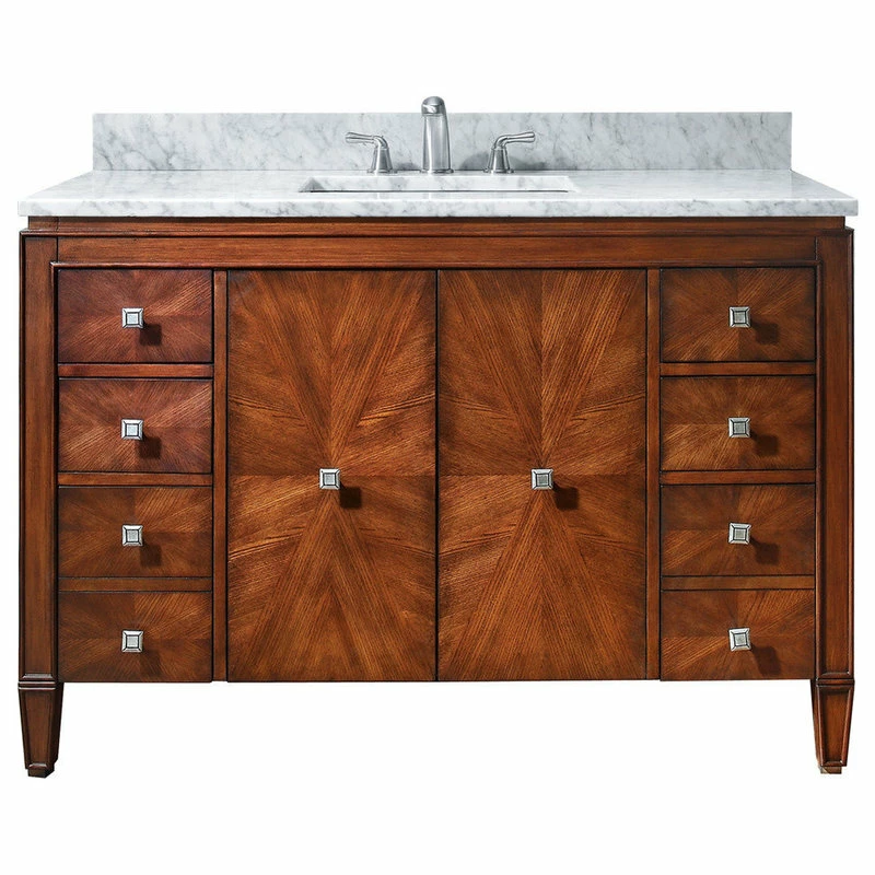 The Brentwood 49 in. vanity in new walnut is a beautiful combination of modern and traditional design. Constructed of solid poplar wood and elm veneers, special antique nickel hardware, soft-close hinges and wood-matched design doors.