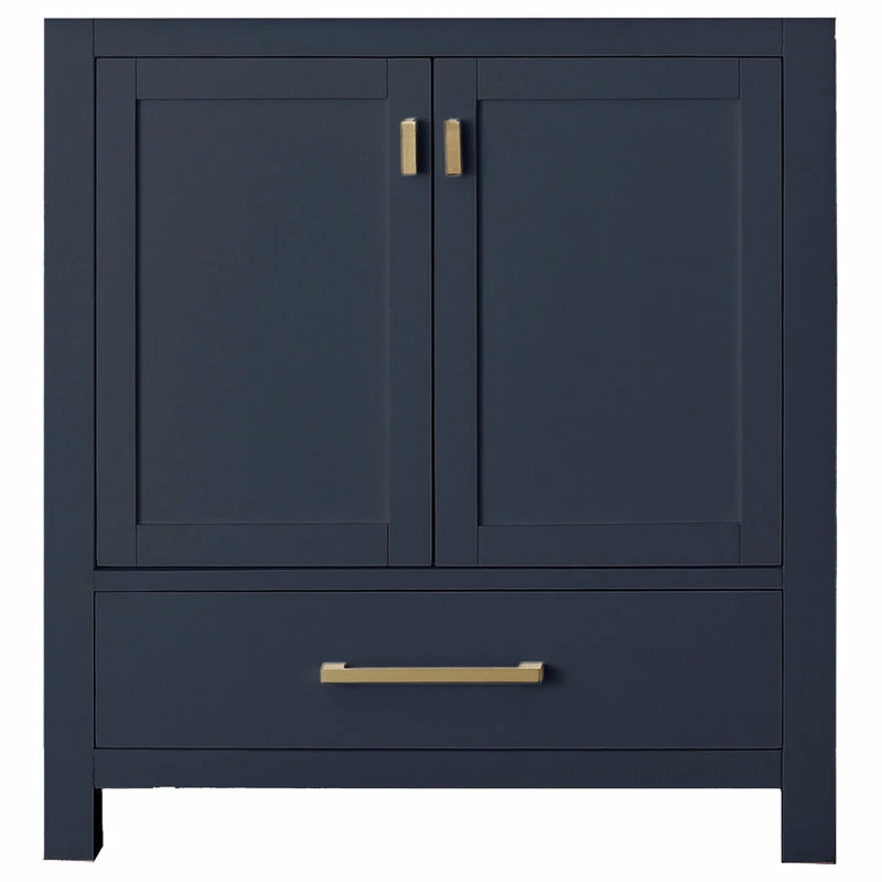 The Modero 30 in. vanity has a simple clean design with an elegant Navy Blue finish and matte gold hardware. It is constructed of solid poplar wood and veneer with soft-close doors and drawers that showcase its quality. Match it with the natural beauty and durability of a stone top and you create the perfect vanity ensemble.