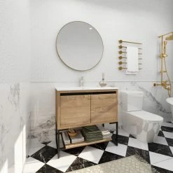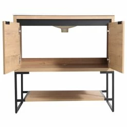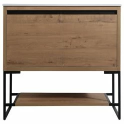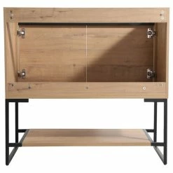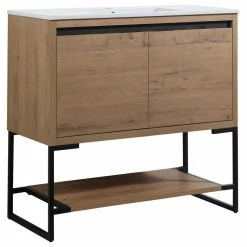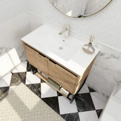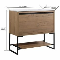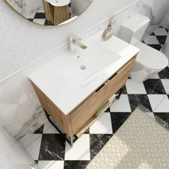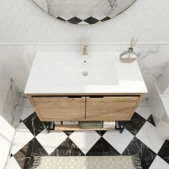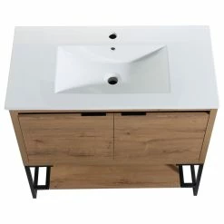 - This vanity’s angular, geometric freestanding design cues give it a contemporary feel, while its plywood construction makes it sturdy and durable.