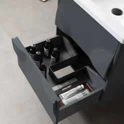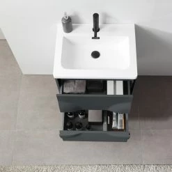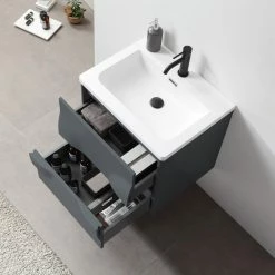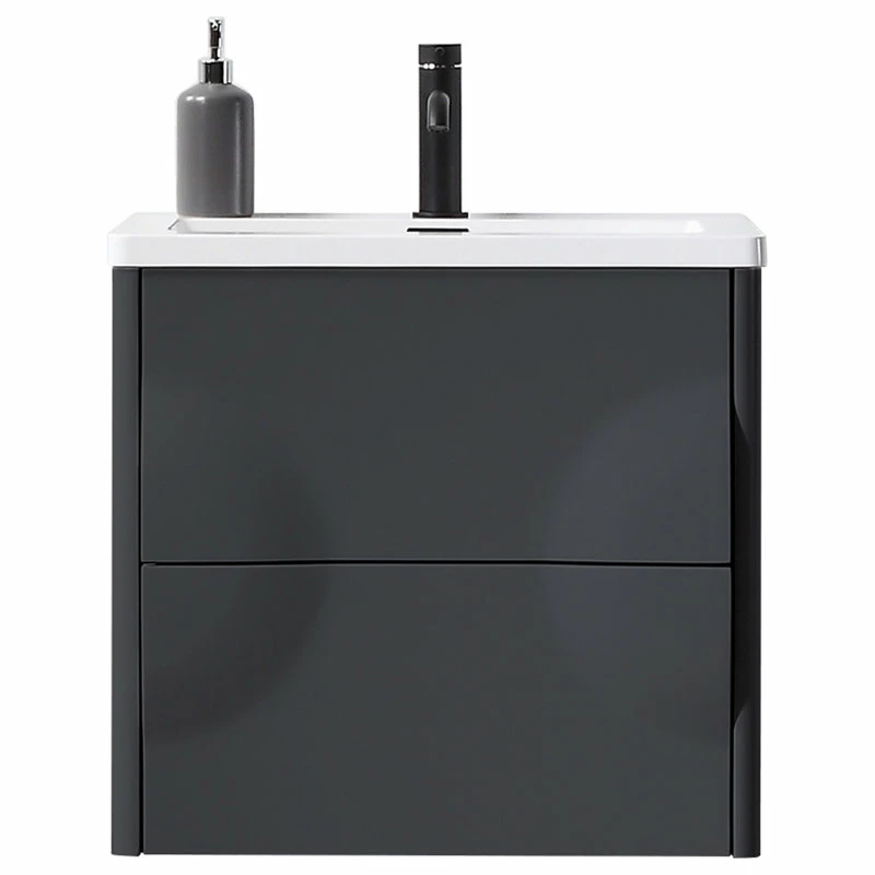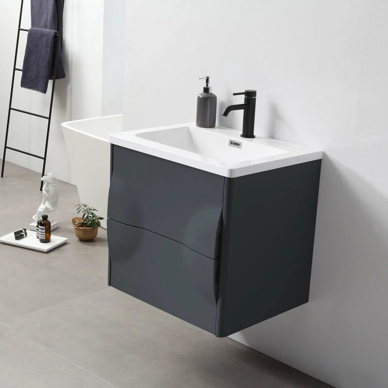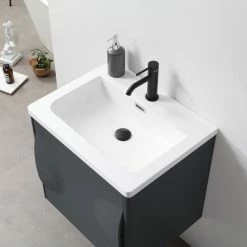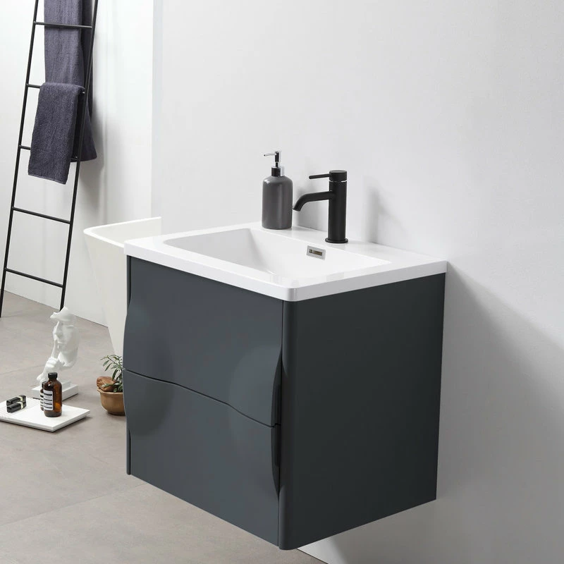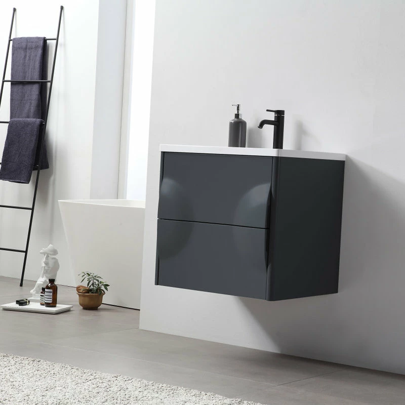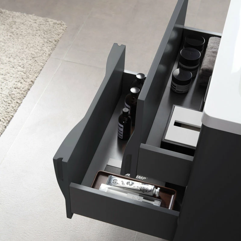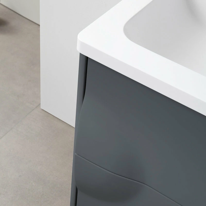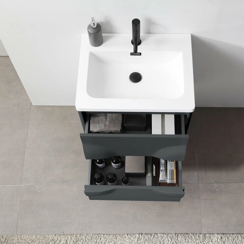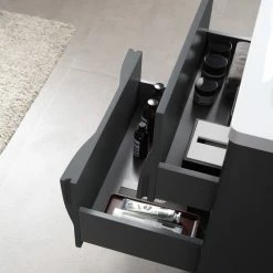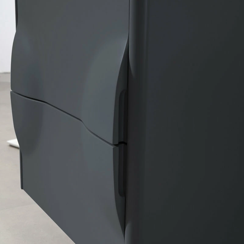 Modern artistic characterize the 24-inch wide Colmar bathroom vanity. Featuring dark gray finishing, this wall-mounted piece boasts two handle-less drawers with large storage space in style. Two half-oval pop-outs on each side perfectly and uniquely hide the drawer opener into one complete fashionable design. This well-designed product gives users a complete upgraded version of visibility to their new bathroom fixtures.