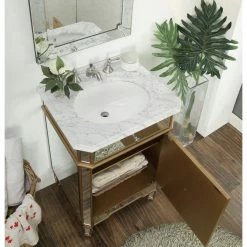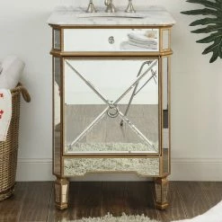 This mirror Reflections powder room ASGER bathroom vanity features a smooth, transitional style and looks. Large mirrored panels on all sides of the cabinet, gold base finish with brush strokes to enhance the vantage look. Large mirrors give the illusion of extra space. The ASGER meets contemporary classic in this exquisite creation worthy of an empress. This vanity provides opulence with lavish materials and premium features.
