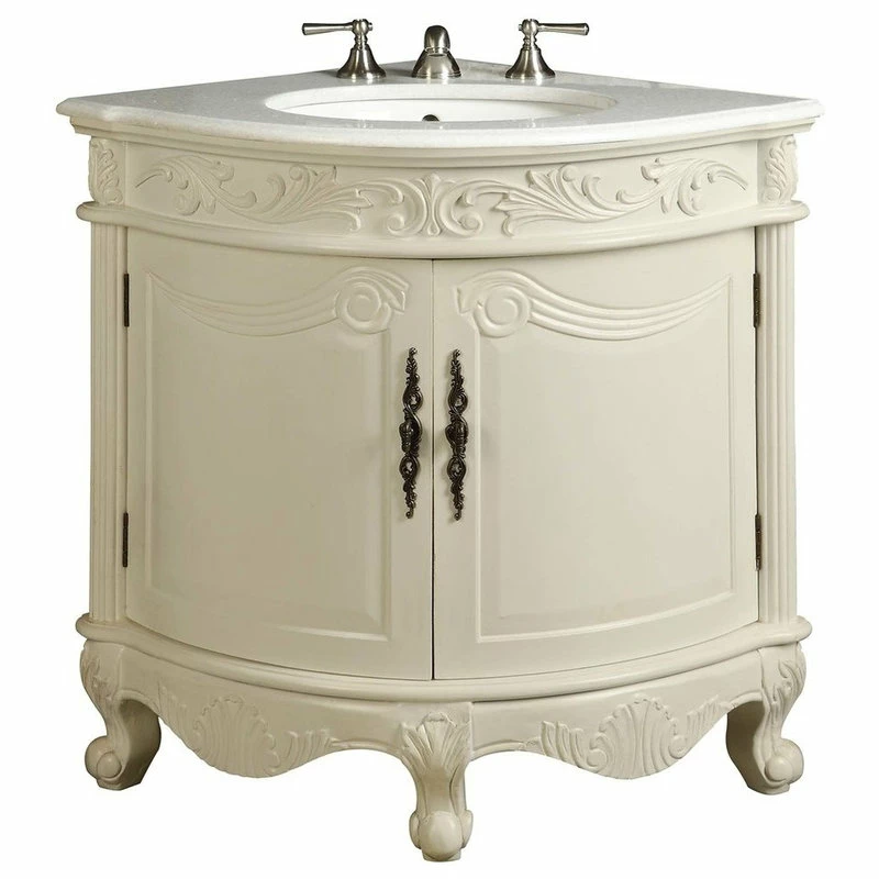 bay-view sink vanity is corner unit specially design for a smaller bathroom. This piece is carefully handcrafted of sturdy wood and finished in a antique white color. Its striking appearance will bring delight to any bathroom furnishing.
