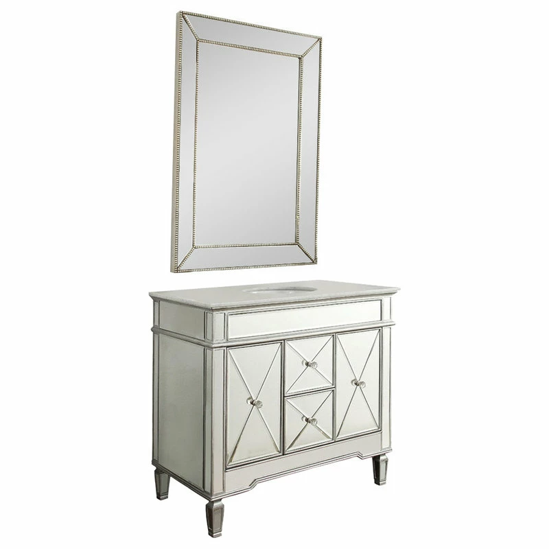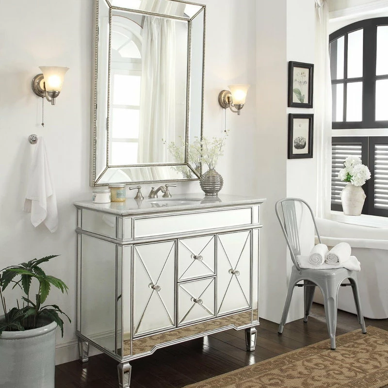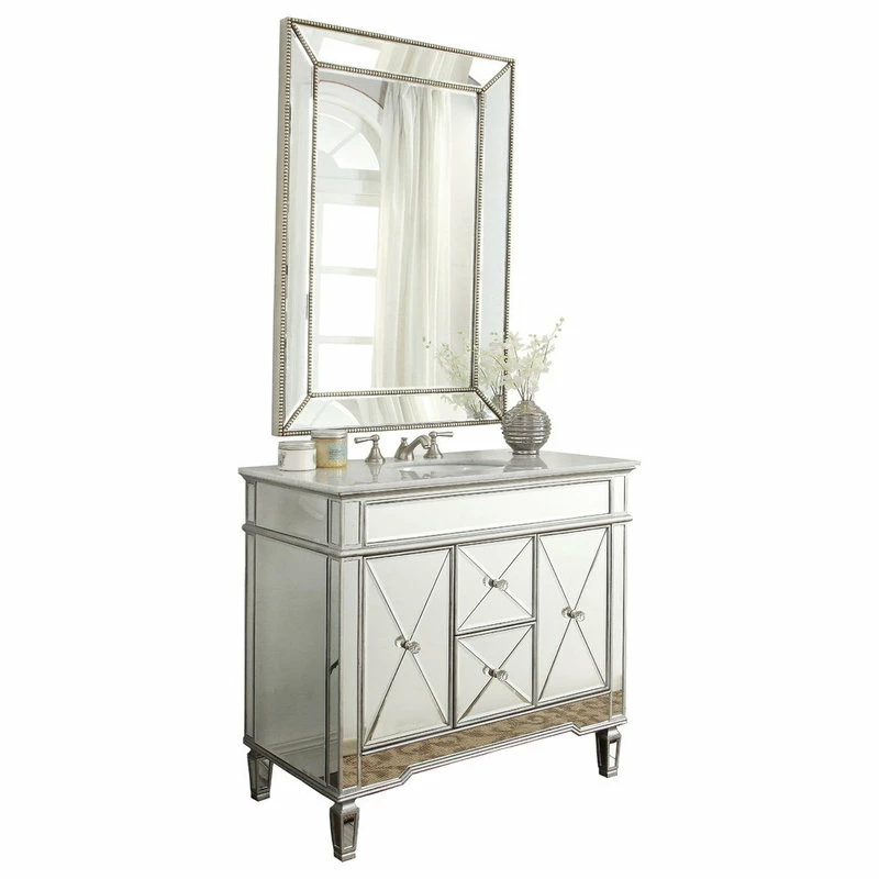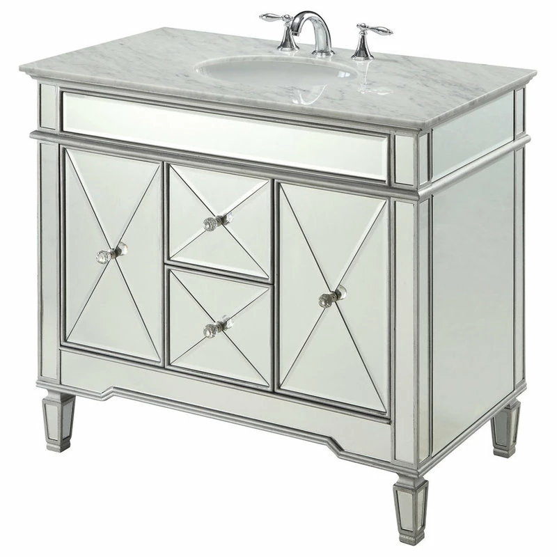 add a touch of sophistication to your bathroom with this modern adelia sink vanity. In addition its luxurious finish, which is a solid body of beveled glass mirrors, this vanity features an italian carrara marble counter-top and double-doors that open into ample storage space and functional drawers.