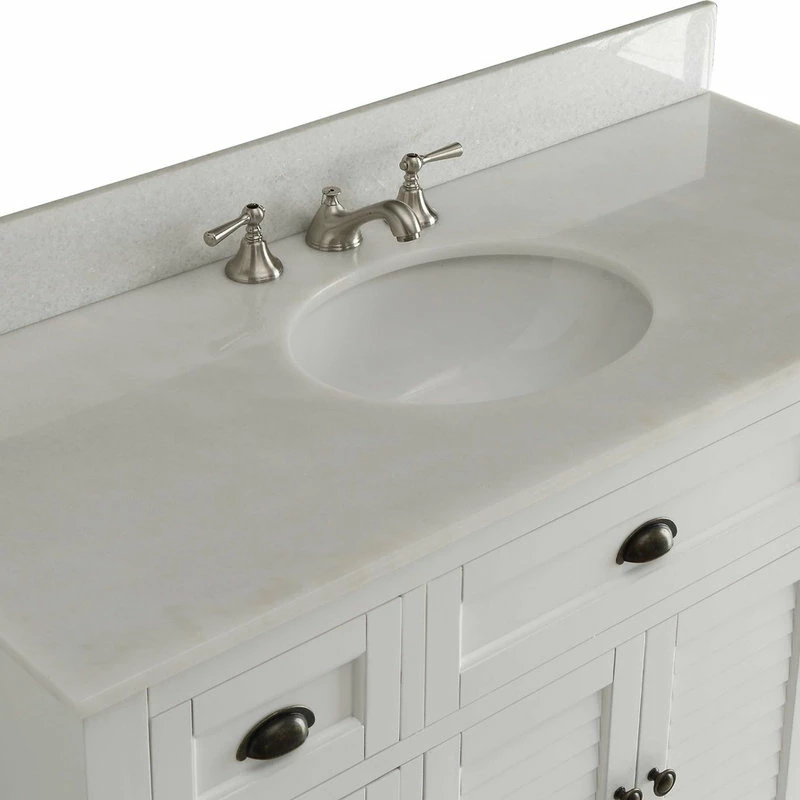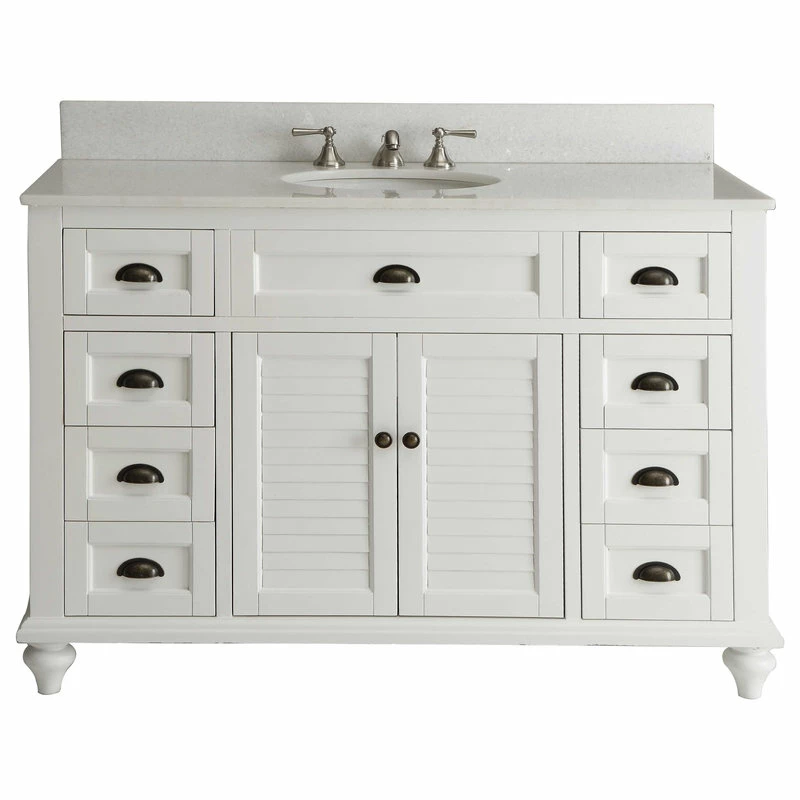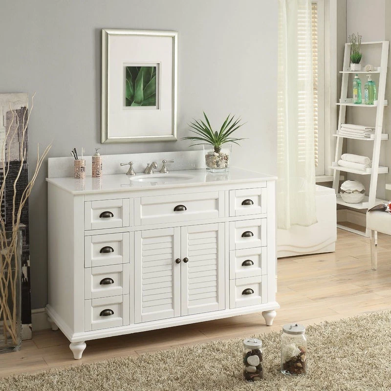 The plantation-inspired look of this cottage-style sink cabinet will add casual elegance to any bathroom decor. Shutter-style door with a white finish, this bathroom vanity offers a look that will create a relaxing retreat in any home. The vanity is made with quality materials.