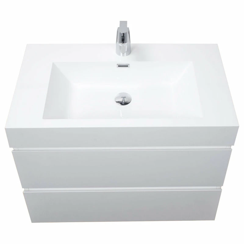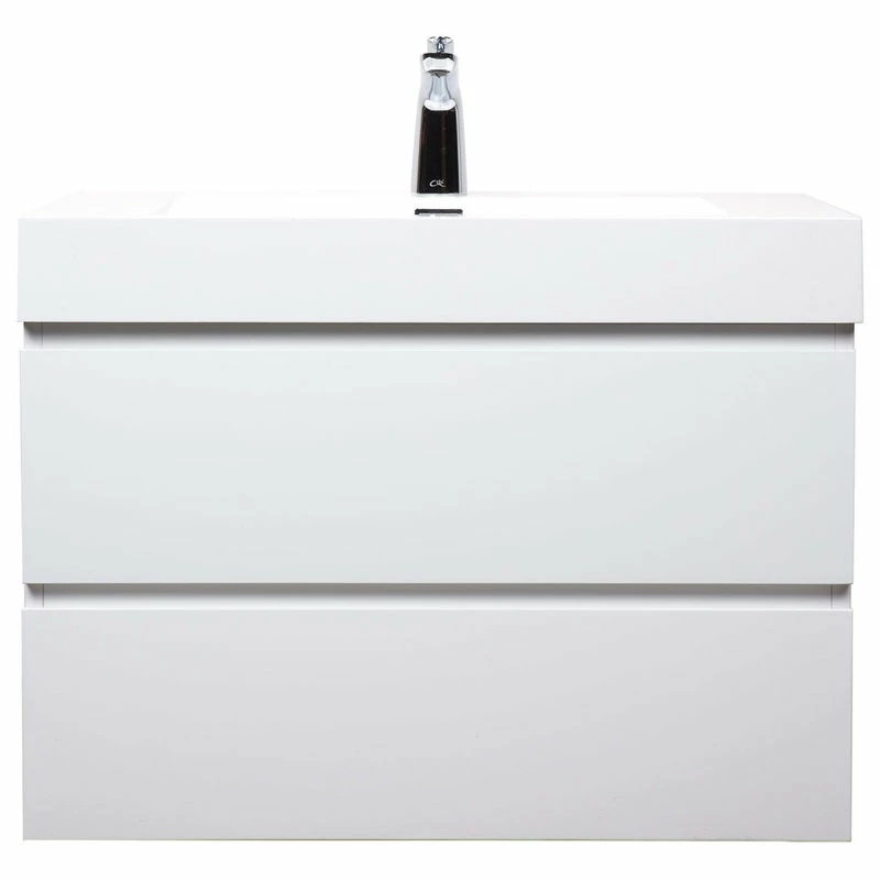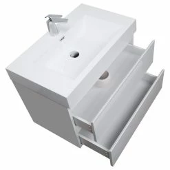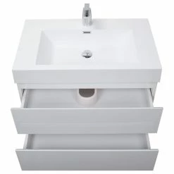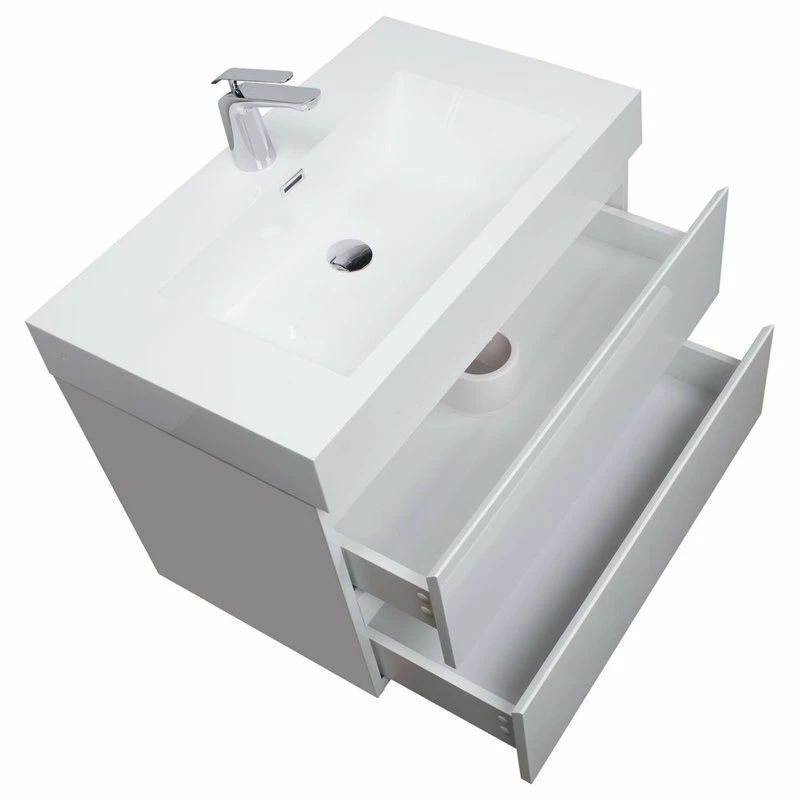 This 31.5″ Angela wall mounted European styled bathroom vanity provides a large integrated counter and 2 soft closing drawers with cut out for plumbing,giving bathrooms tremendously clean, contemporary lines with exchangeable space. All the wooden elements are finished with a polyester resin finish to guarantee total water resistance. The elegant integrated reinforced resin countertop is fitted for a single faucet mechanism.