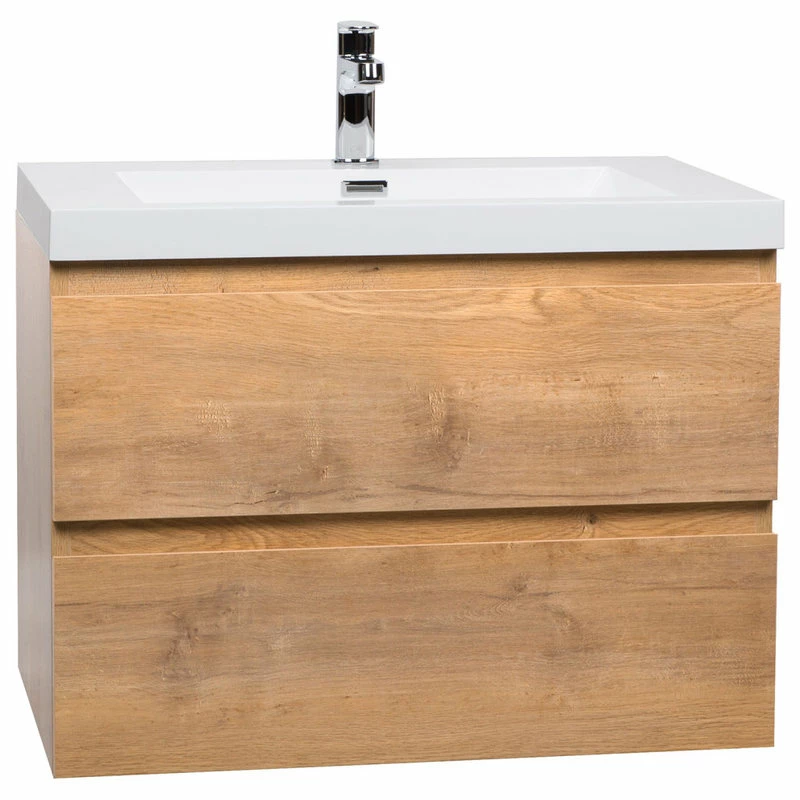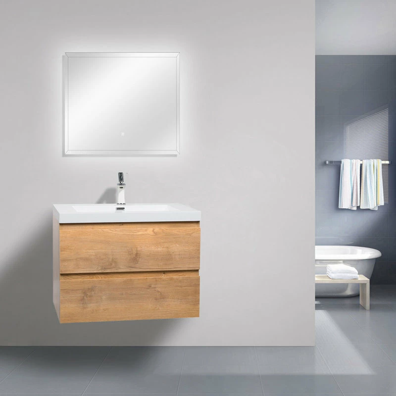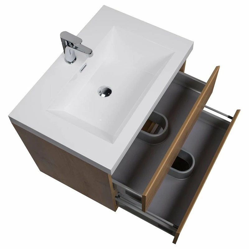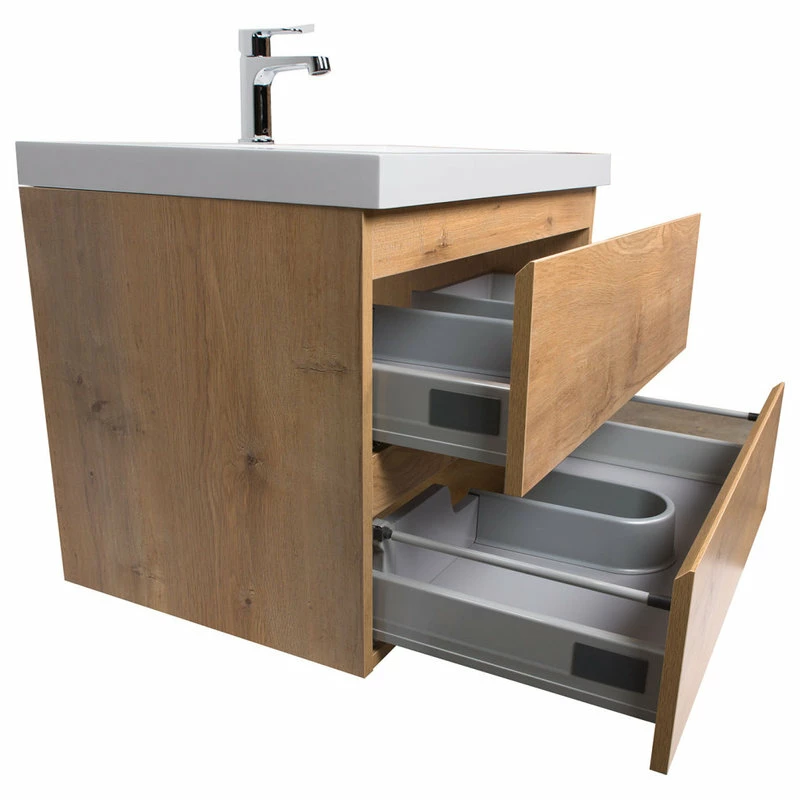 This 29.5 Angela wall mounted European styled bathroom vanity provides a large integrated counter and 2 soft closing drawers with cut out for plumbing, giving bathrooms tremendously clean, contemporary lines while exchangeable space. All the wooden elements are finished with a polyester resin finish to guarantee total water resistance, the drawers are equipped with heavy duty metal wall sides. The elegant integrated resin countertop is fitted for a single faucet mechanism.