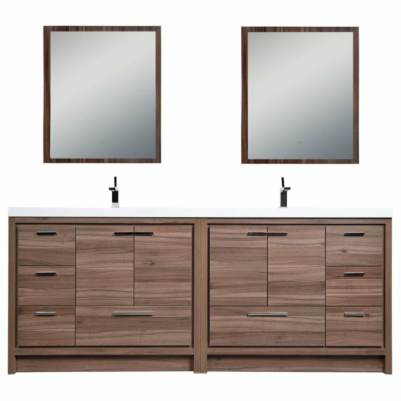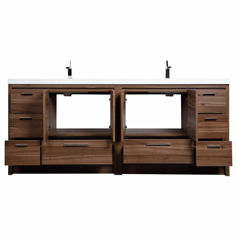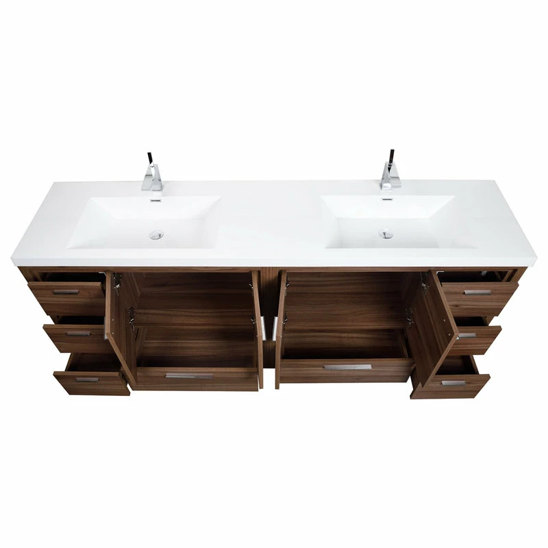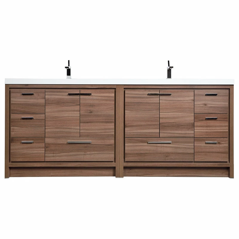 Live on the cutting edge with the Enna 83.4″ bathrom vanity with double sink. This free standing vanity offers great storage with a smooth soft-closing, (8)fully functional drawers and (4)doors. This spectacular modern piece features integratged gloss white top and sink. Polished chrome drawer pulls add a compelling dash of visual contrast.