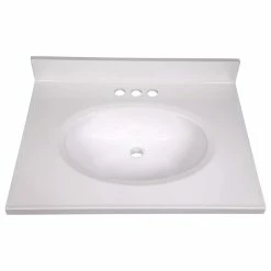 - Solid White cultured marble top has a non-porous surface that is easy to clean and stain resistant; – 3 pre-drilled holes allow for a 4-inch center mount faucet and integrated backsplash prevents water damage