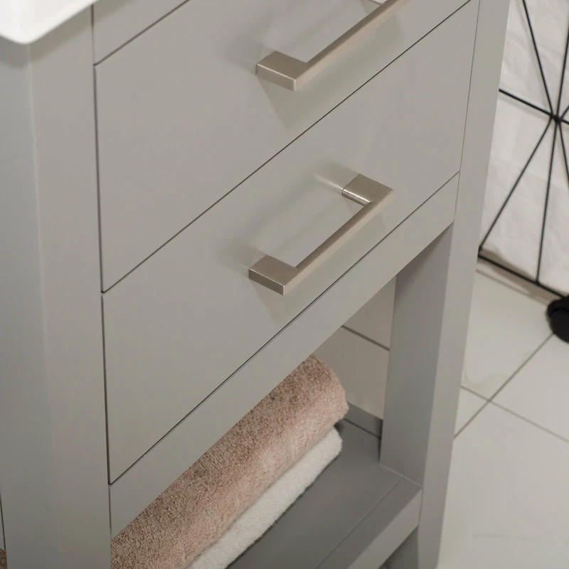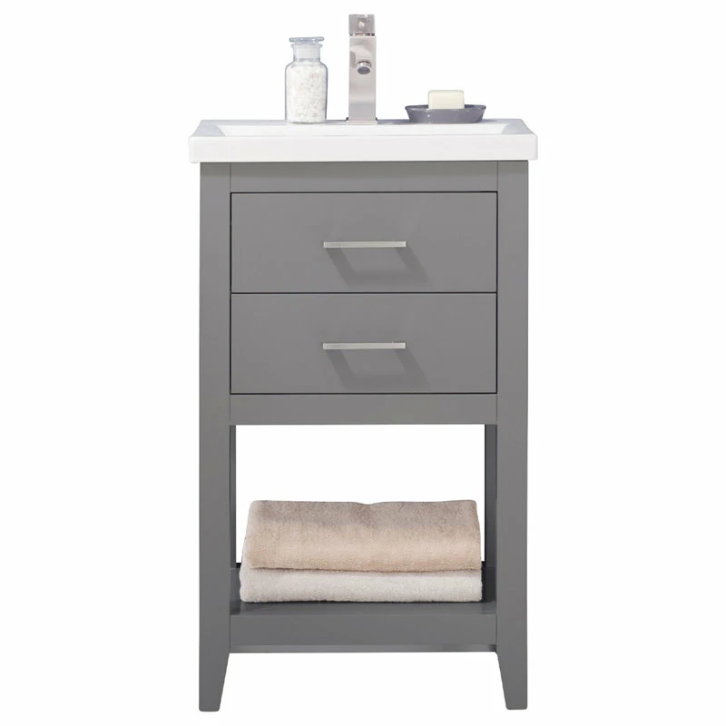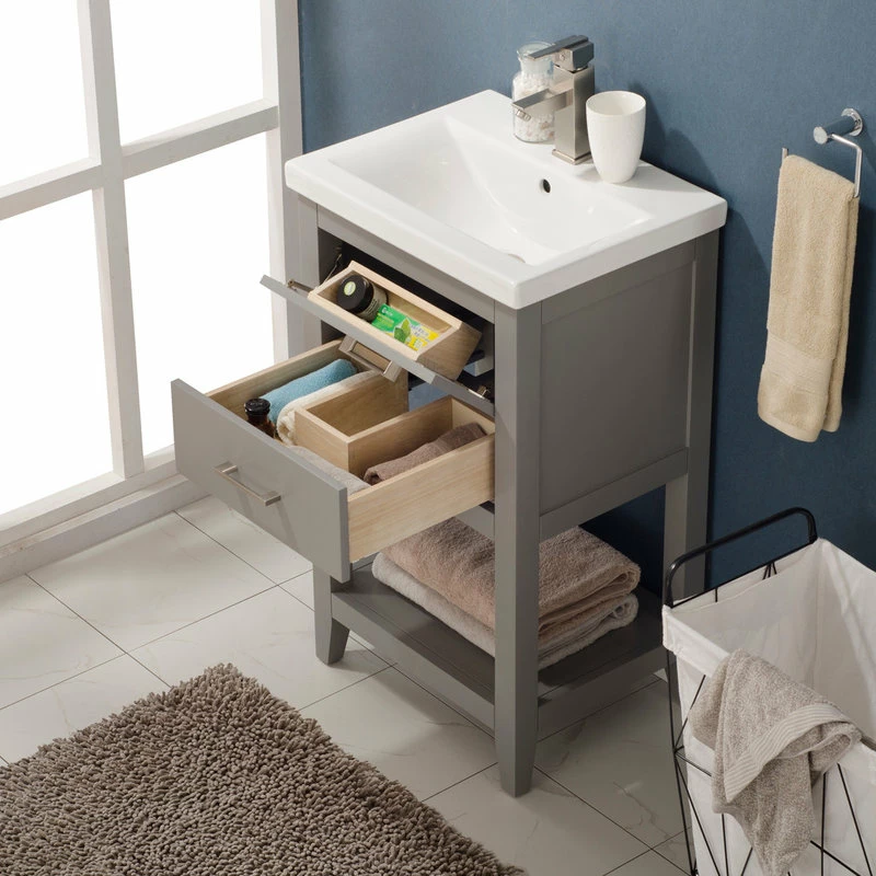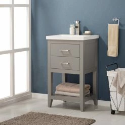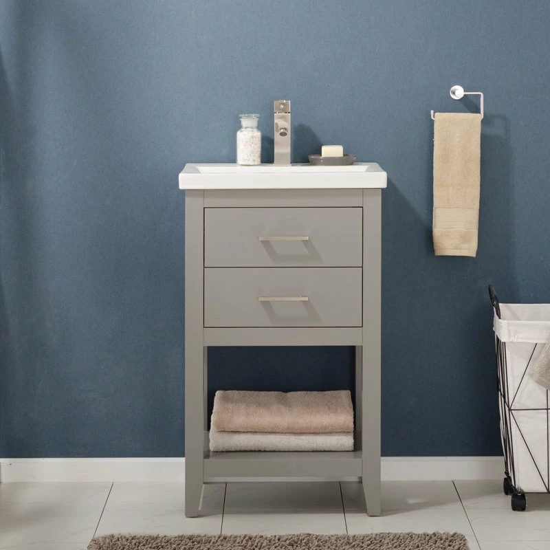 The Cara 20″ Single Sink Vanity by Design Element provides the perfect finishing touch to your bathroom remodel project. Constructed of solid hardwood, this vanity will maintain its beauty and functionality year after year. The porcelain countertop and integrated sink with overflow perfectly matches the styling of the cabinet, and is extremely simple to maintain. There is ample storage space for this vanity despite its small size. Hidden in the flip down drawer is a unique and useful storage box, and a second fully functional drawer constructed with dovetail joinery sits on soft close glides. There is also an open shelf at the base of the cabinet. The included Satin nickel hardware provides the perfect finishing touch to the gray cabinet. Faucet and drain are not included.