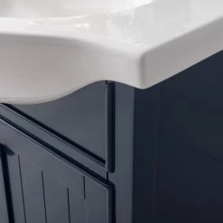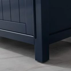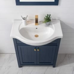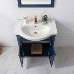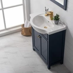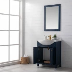 The Marian 30 inch single sink vanity by Design Element provides the perfect finishing touch to your bathroom remodel project. Featuring a solid hardwood frame, this vanity will maintain its beauty and functionality year after year. The porcelain countertop and integrated sink with overflow perfectly matches the styling of the cabinet, and is extremely simple to maintain. Opening the 2 soft closed doors reveals an ample storage space. The included brushed finished hardware provides the perfect finishing touch to the blue cabinet. Faucet and drain are not included.