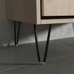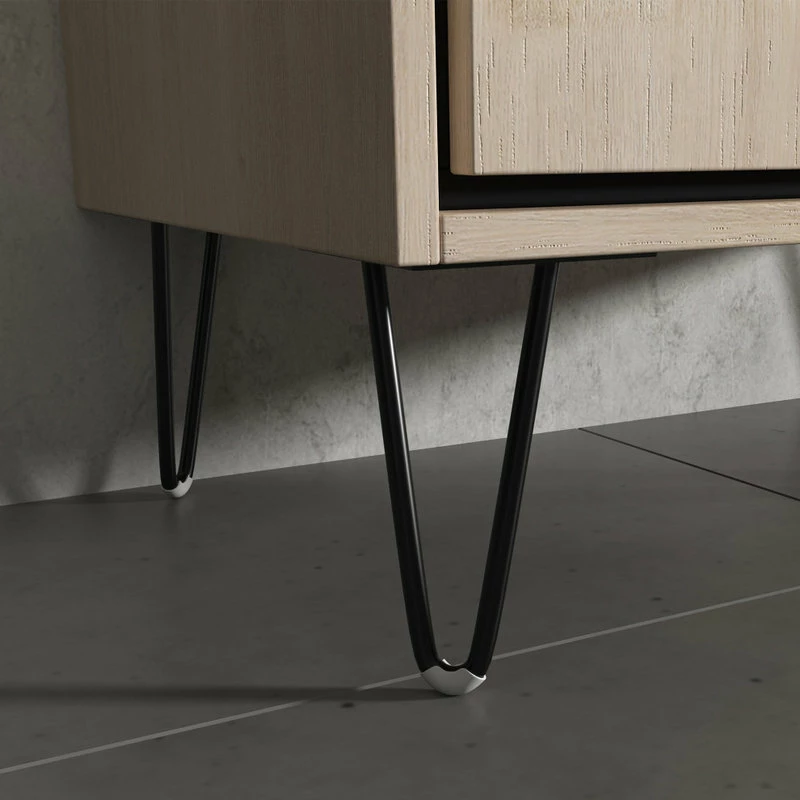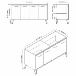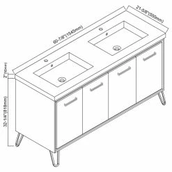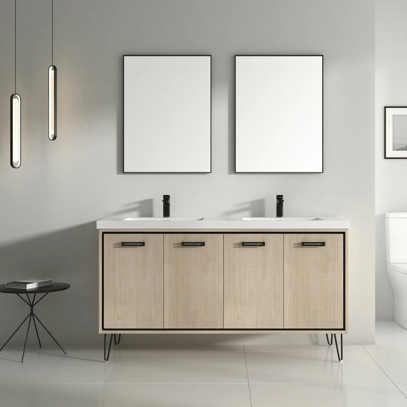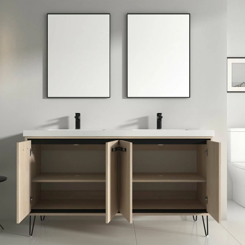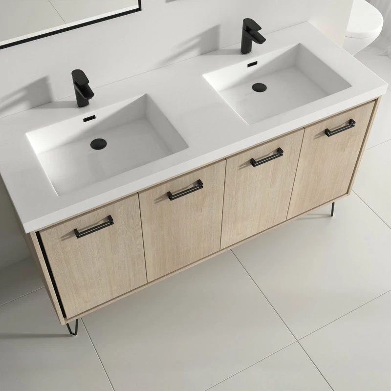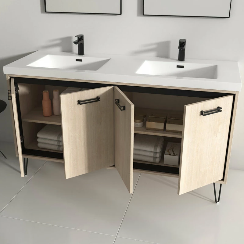 Wall-mounted or freestanding (on 4 included V-shaped black metal legs) wood base with 4 soft-close doors and 4 shelves. Vanity base is available in tan (wood grain) or glossy white. Includes white resin basin with one faucet hole for each sink