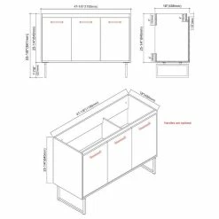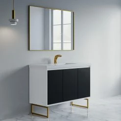 Wall-mounted or freestanding (on 2 included Rectangle-shaped golden metal legs) white vanity base with 3 soft-close doors. Vanity doors are available in Nero Matte Black, Dark Blue, Coral Red, Oak Natural, White Porcelain and Saffron Yellow. Includes white resin basin with one faucet hole. Doors can open without handles. Handles and faucet not included