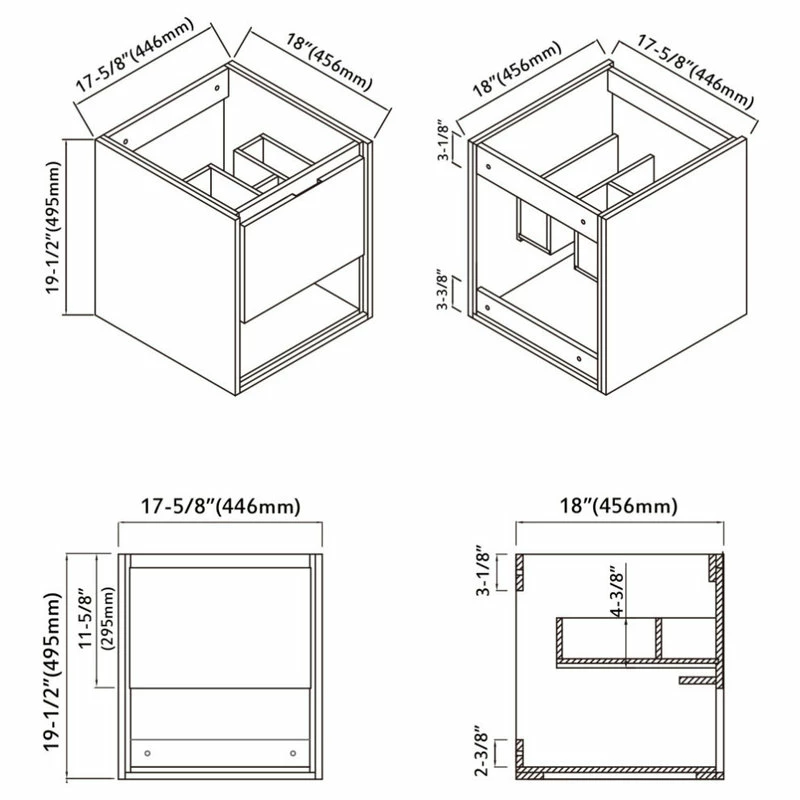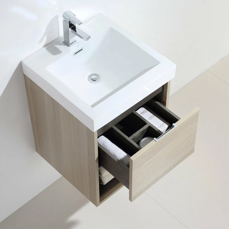 Mounted floating laminated wood base cabinet with one soft close drawer, one shelf and white resin basin/top with one faucet hole. Available in off-white, tan-grey, and bluish-green