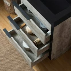 Freestanding laminated wood base cabinet with three soft close drawers and white or black resin basin/top with one faucet hole. Cabinets available in white and stone washed grey