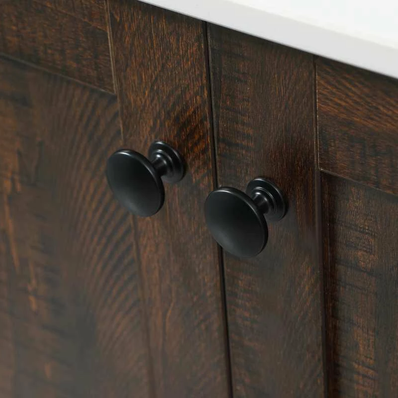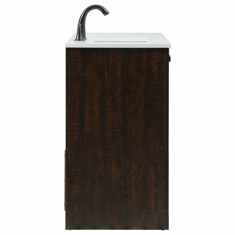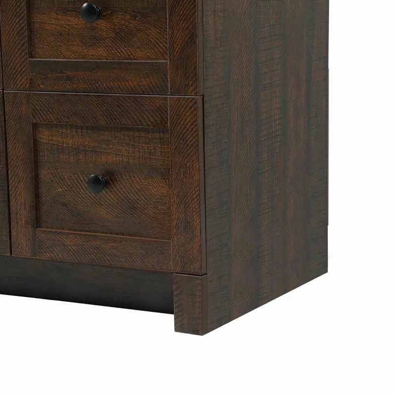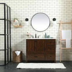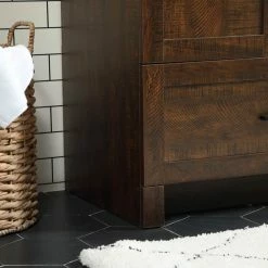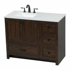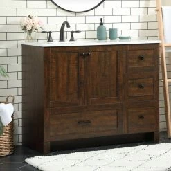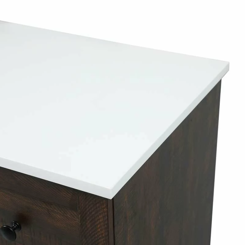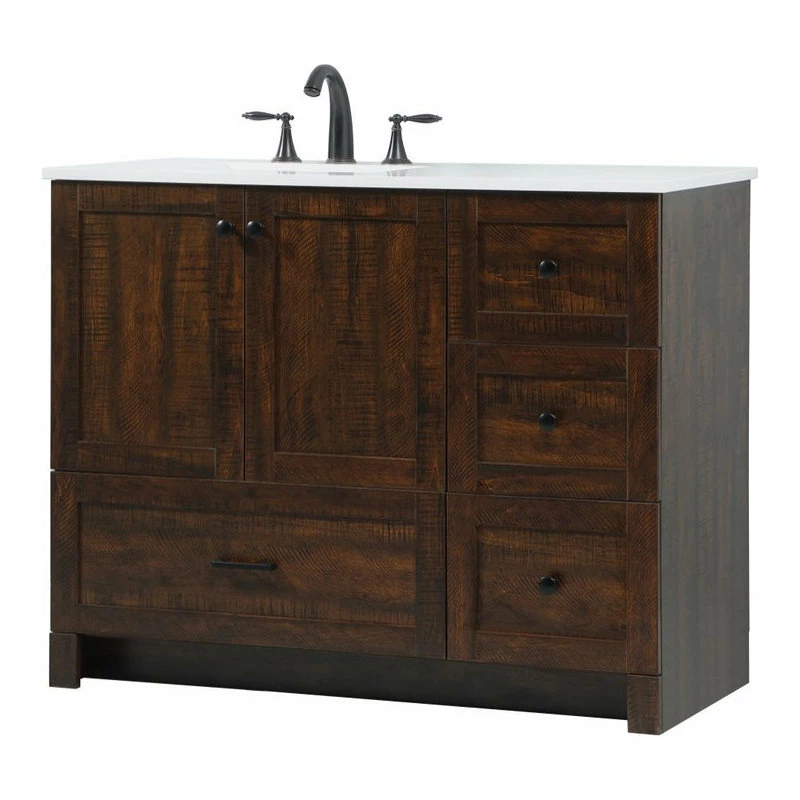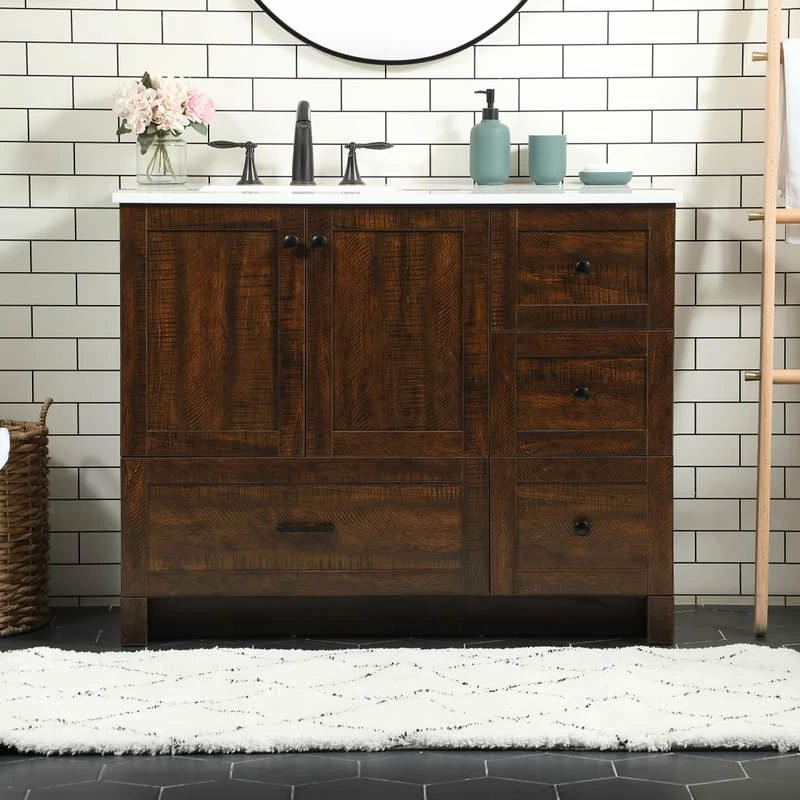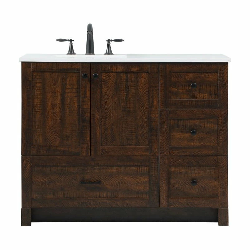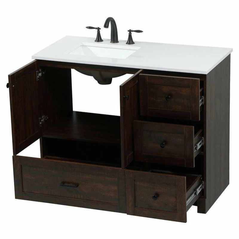 Delve into a world of minimalistic fashion and contemporary styling with this farmhouse 42″ vanity. The clean faux lines anchors the weathered design. Black handle adorns the two doors hiding the base of the integrated porcelain sink while the bottom drawer and side drawers allow you to store your bathroom necessities and toiletries. It is the perfect vanity for any bathroom, regardless of size.