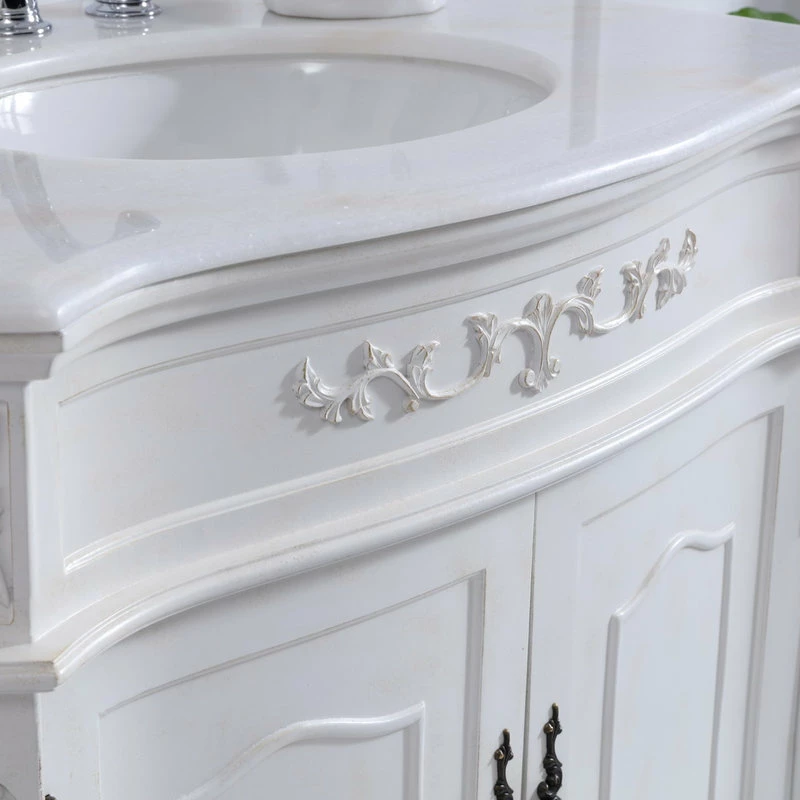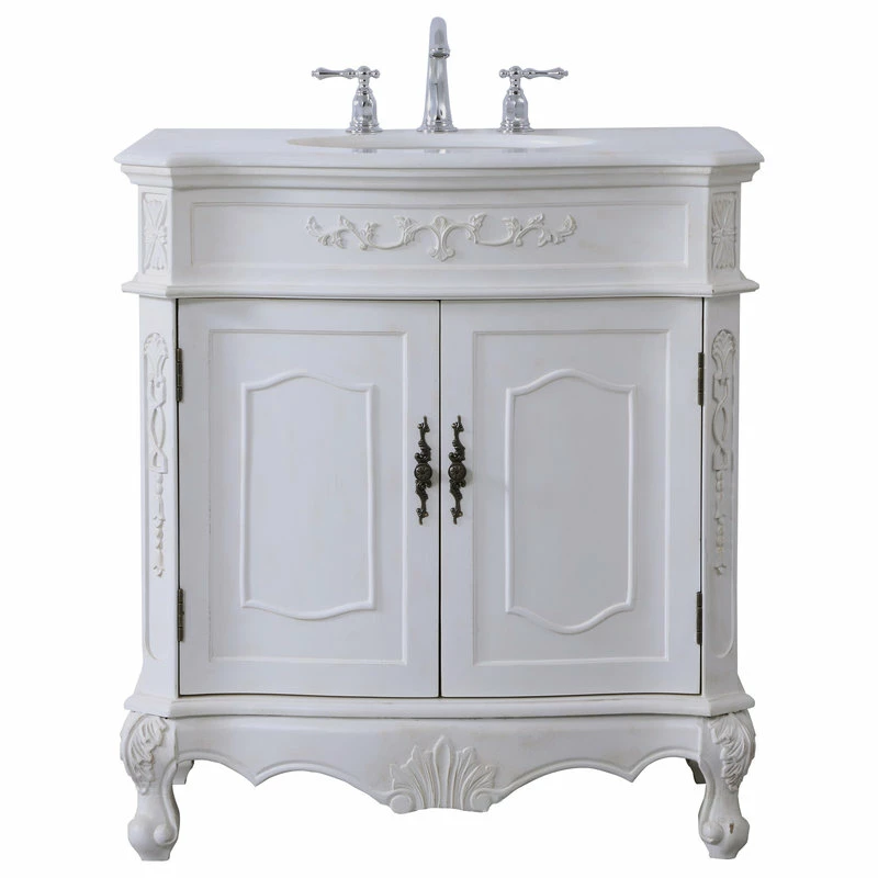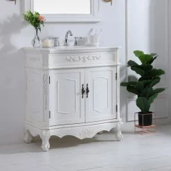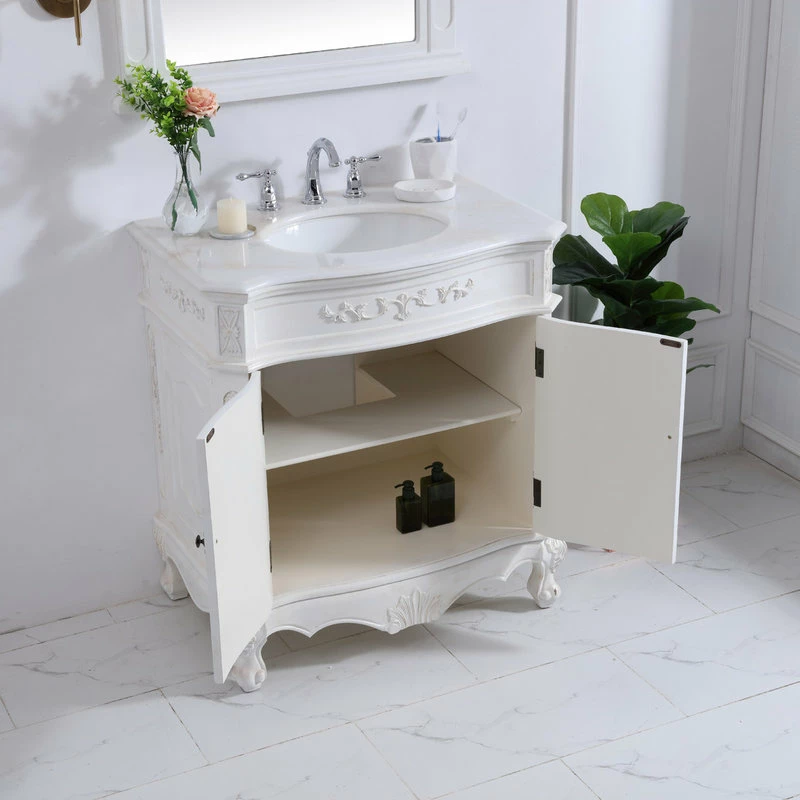 Elegance and opulent beauty is always a timeless tradition, and this traditional style 32″ vanity reflects the aesthetics of those bygone days. Hand painted in an antique white finish, adorned with intricate floral designs, standing on stylishly carved solid wood French scroll feet, and topped with a luxurious white marble counter top with occasional light brown veining and oval white porcelain undermount sink, you can’t deny the attractive charm. The two cabinet doors accentuated with equally intricate and stunningly lovely floral bronze finish door knobs open to reveal ample storage space to put away al your bathroom essentials and necessities. Place this vanity in your home or office bathroom, and always live in timeless luxury and elegance!