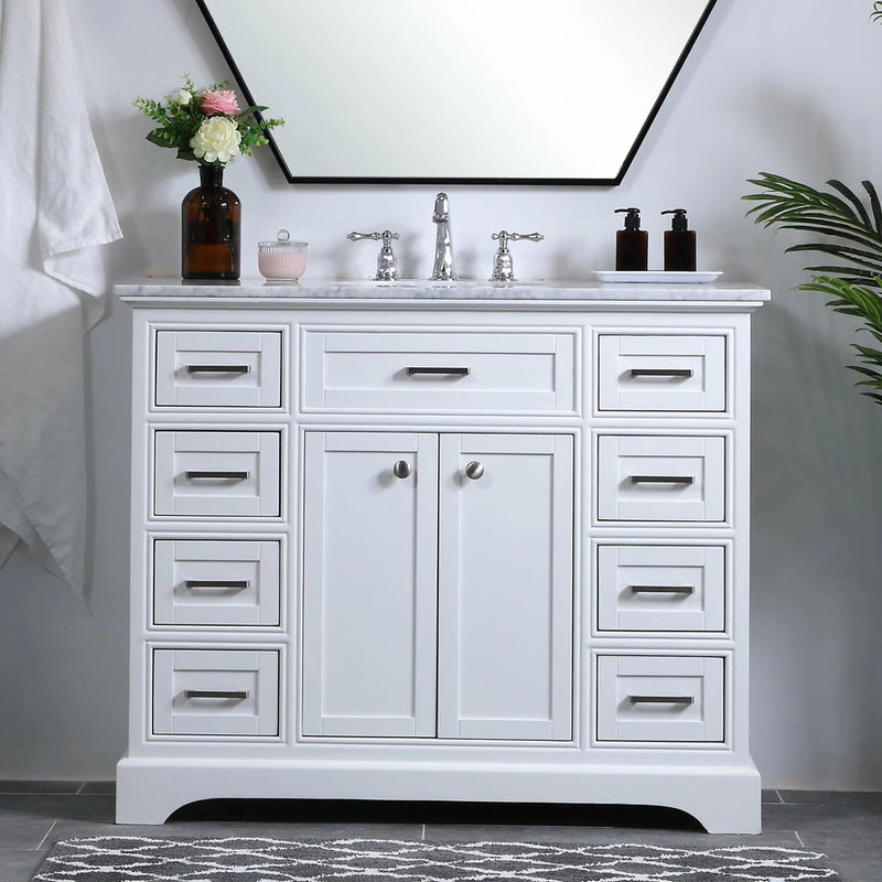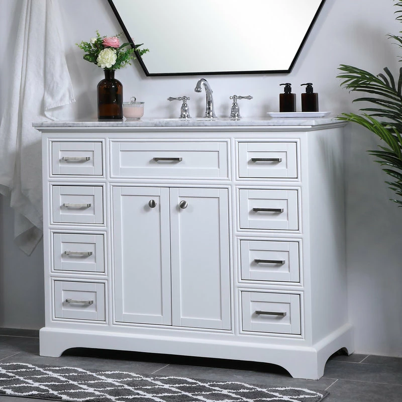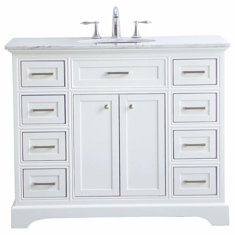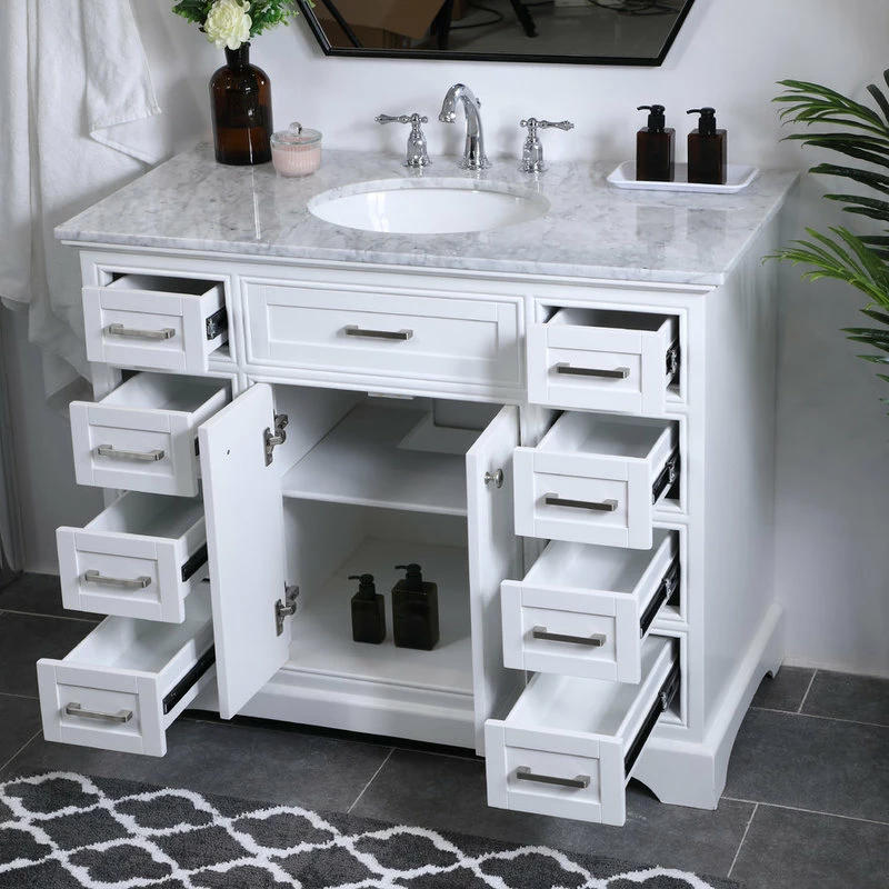 This spacious 42″ vanity is stylishly modern, yet sleek and unpretentious. The subtle white Italian Carrara marble counter top compliments the hand painted white, gray, or teak finish and brushed steel bar handles and cabinet door knobs. The two center recessed panel cabinet doors and three spacious drawers on either side reveal ample storage space for bathroom toiletries and necessities. A wonderful addition to any bathroom or powder room, this vanity can bring a balance of simple beauty and function!
