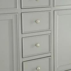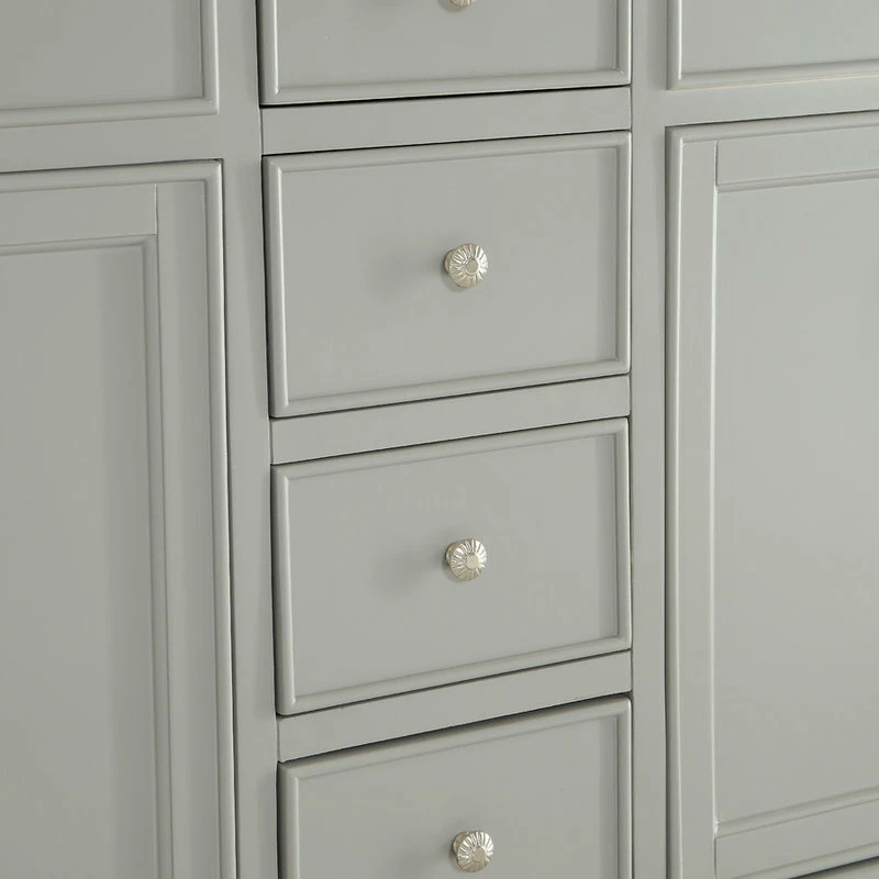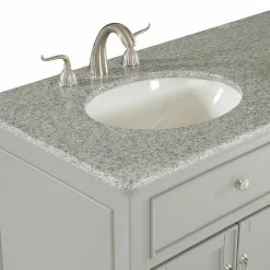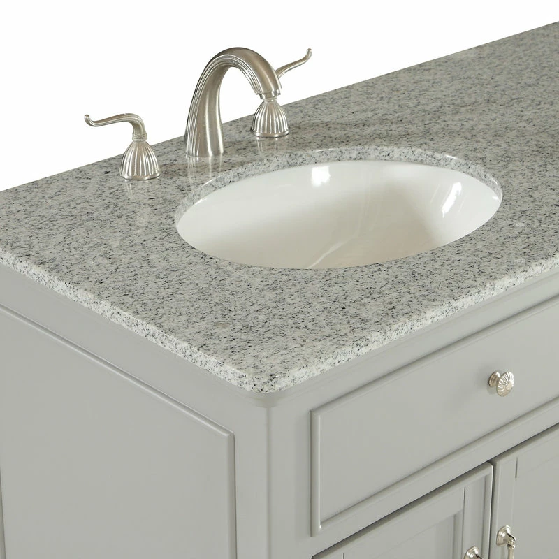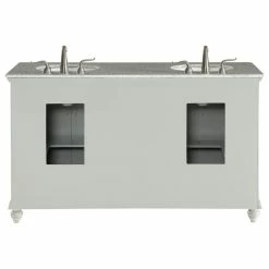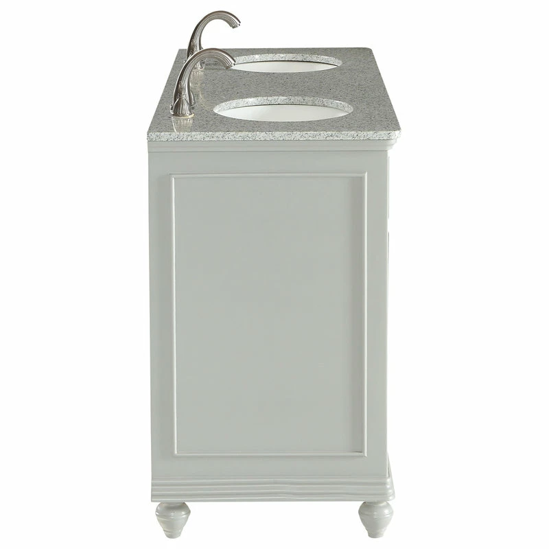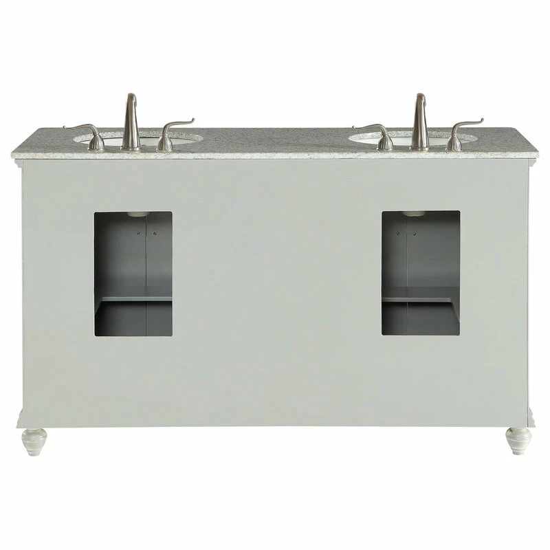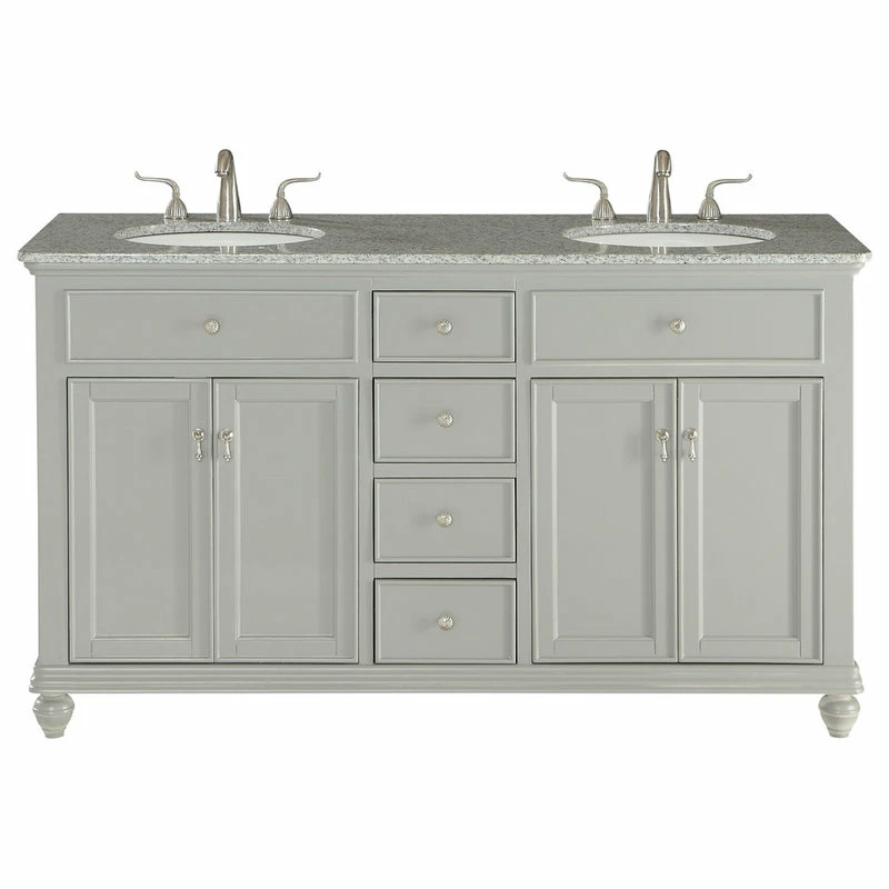 A sleekly styled 4 doors and 4 drawers, granite-topped bathroom vanity like this can only bring a smile of appreciation for its simple beauty and clean lines. With an authentic Kashmir white granite counter top, double oval white porcelain sink, hand painted soft grey cabinet, 2 set of soft-close doors on each side with a shelf inside, 4 center drawers, brushed steel hardware and carved bun feet, this elegant, transitional vanity balances form and function. Measurements: W60″xD21″xH35″