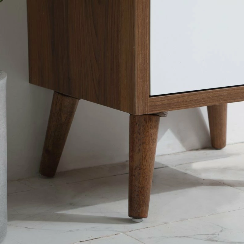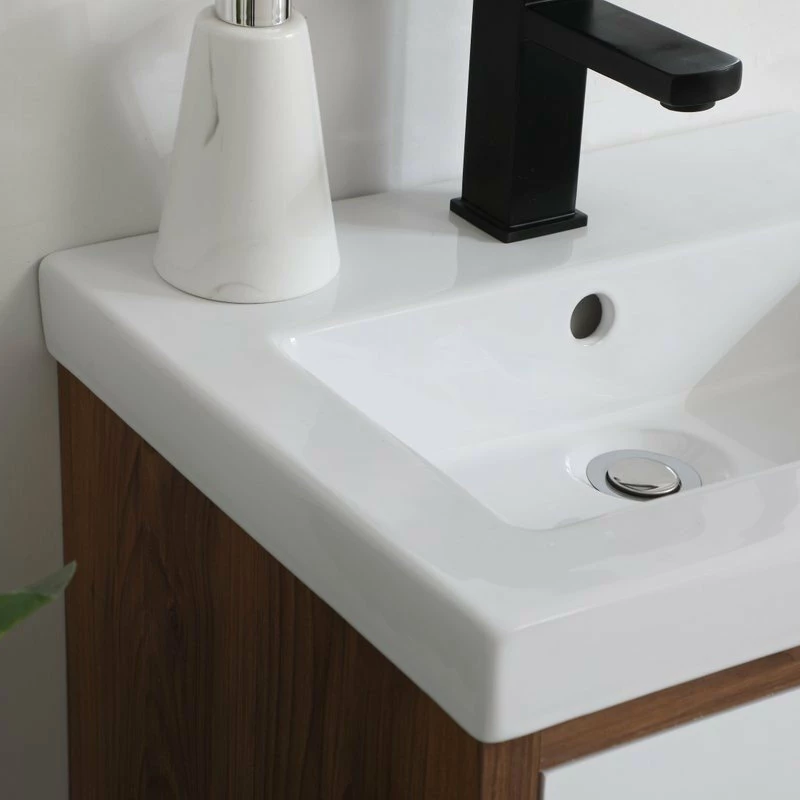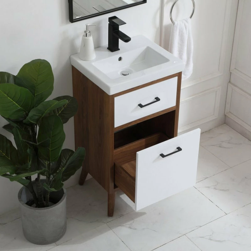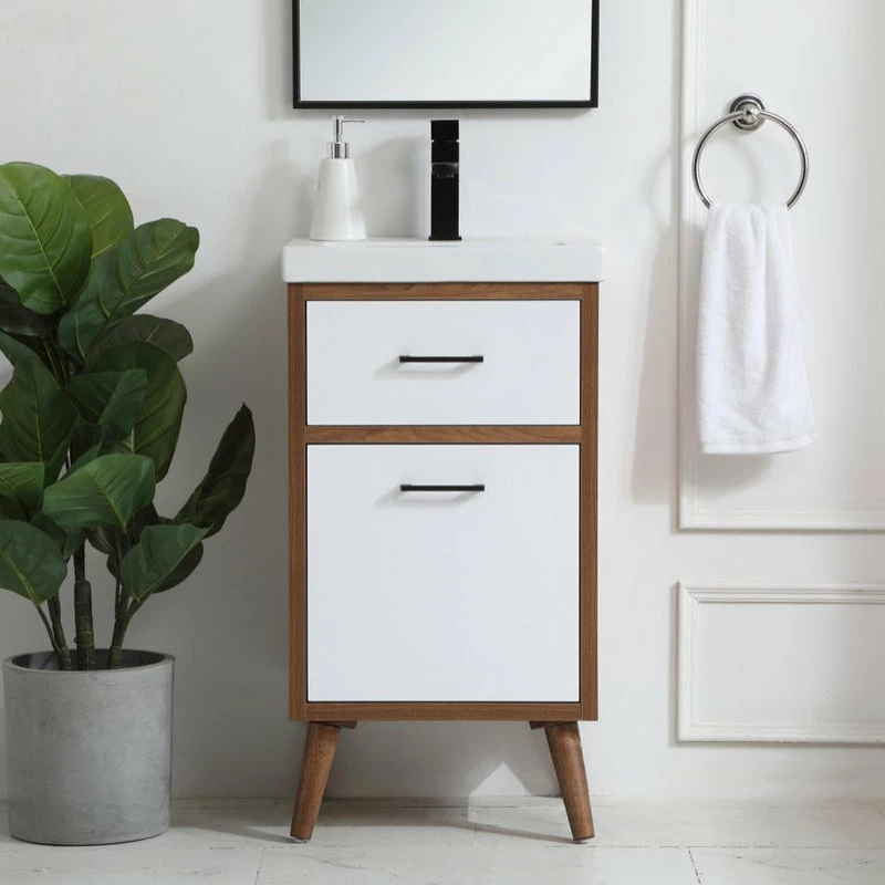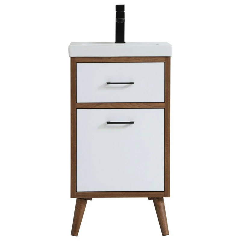 Delve into a world of minimalistic fashion and contemporary styling with this midcentury modern 18″ vanity. The clean lines anchors the design, while the oblique tapered cylinder legs add subtle interest. However, the artful juxtaposition between the walnut brown and matte white creates a blend of bright modernity and classical traditions. A black handle adorns the top fake drawer hiding the base of the integrated porcelain sink while another one allows you to pull the bottom drawer out, letting you store your bathroom necessities and toiletries. The compact size makes it the perfect vanity for any bathroom or powder room, regardless of size.
