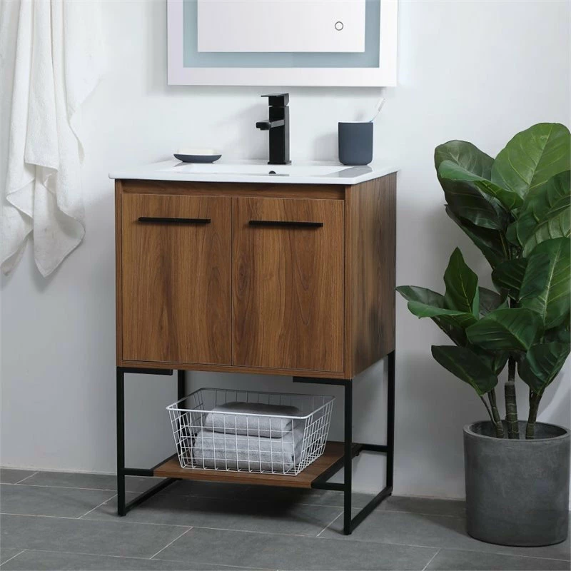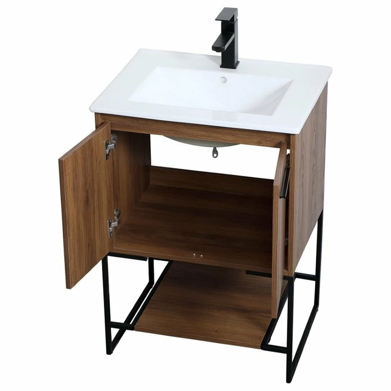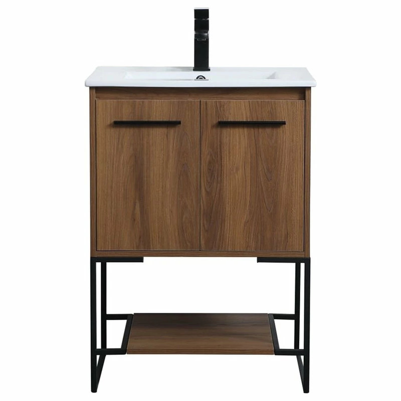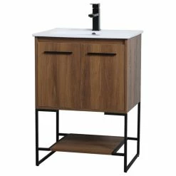 Live in modern comfort with this 24″ walnut brown finish vanity. Dressed in a concrete gray and sleek black metal hardware, its contemporary style will have your bathroom or powder room elevated in industrial sophistication. The open shelf at the base and two doors reveal ample storage space for your bathroom essentials and miscellany. Clean lines create its own visual interest, adding trendy looks to your already chic room.