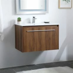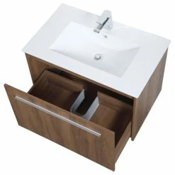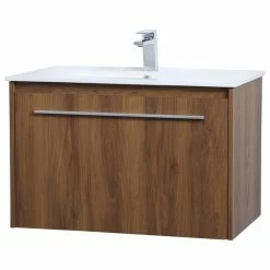 Enjoy the minimalistic style of this 30″ floating vanity in a walnut brown finish. The entire front face pulls out to reveal two smaller drawer spaces within. Topped with a sleek white countertop and an undermount sink, its urbane luxe style will be welcomed by all. The perfect vanity to help expand your bathroom space, you’ll always appreciate its presence.