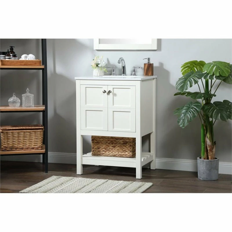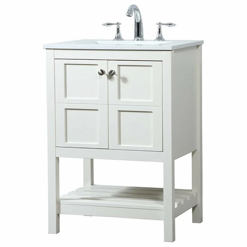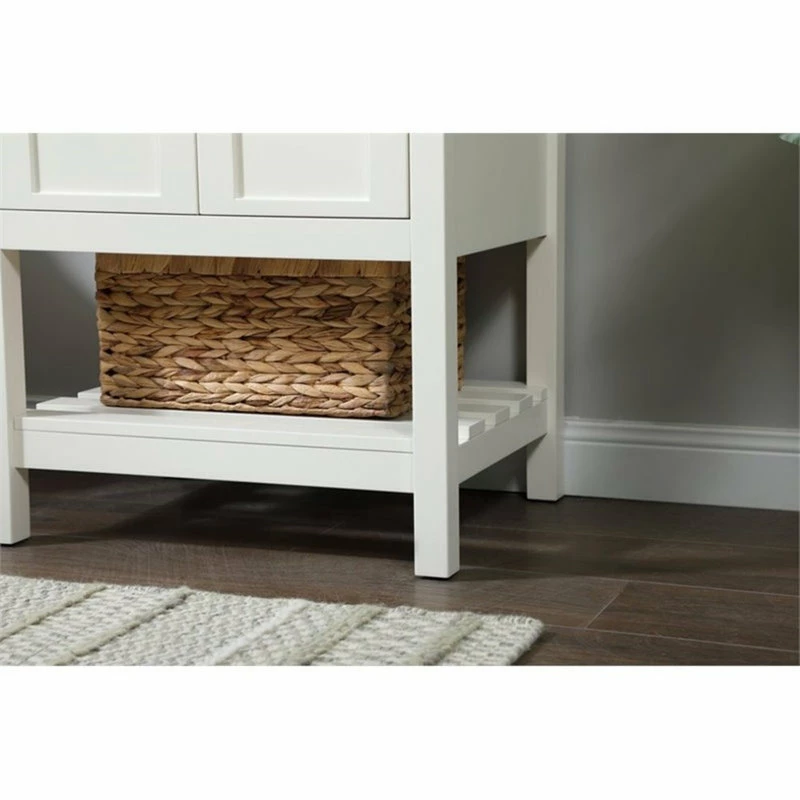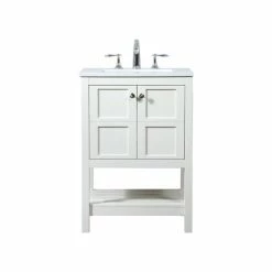 The subtle beauty of the Theo collection vanity exudes comfortable luxury. Its modern, yet traditional beauty will surely dress up your bathroom or powder room without any fuss. The calcatta quartz countertop and porcelain undermount sink shows quiet opulence, and the legs support upright without fail. Brushed nickel hardware complements the classic white finish, with pulls adorning the two cabinet doors, showcasing ample storage space within. Slated shelf allows for additional space to organize your towels. Whether this vanity is in your bathroom or for guests, its presence will surely elevate the aesthetics of your room.