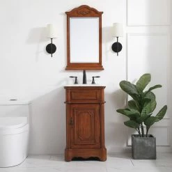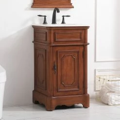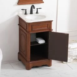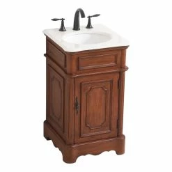 Elegant Decor VF30419TK 19″ single bathroom vanity in Teak. Style: traditional. Collection: Francis. Finish: Teak. Fixture Material: Solid wood and MDF. Hardware Finish: Antique bronze. Hardware Material: Metal. Dimenison(in): 19(L) x 19(W) x 33(H). Countertop Finish: White. Countertop Material: Marble. Countertop Included: Yes. Countertop Dimenison(in): 19(L) x 19(W) x 0.7(H). Countertop Edge Style: Ogee. Sink Material: Porcelain. Sink Dimenison(in): 12.84(W) x 7.5(H) x 10.6(Depth). Vanity Mounting Type: Free-Standing. Backsplash Included: No. Fauset Included: No. Faucet Hole Size(in): 1.36. Faucet Hole Spacing(in): 8. Wood Type: Rubberwood. Drawer Handle Designs: Knob. Shelf Material: MDF. Number of Shelves: 1. Shelf is Removable: Yes. Adjustable Shelves: No. Shelf Dimension(in): 13.52(W) x 16.24(Depth). Shelf Thickness(in): 10.08. Distance Between Shelf and Cabinet/Sink(in): 0.5. Door Thickness: 0.875. Door Handle Designs: Round knob. Door Handle Dimension(in): 0.91(L) x 0.91(W) x 5.32(H). Cabinet Doors Have Magnetic Latches or Catches: Yes. Cabinet Interior Dimenison(in): 13.52(W) x 16.24(Depth) x 19.72(H). Leg Material: Solid wood. Leg Dimension(in): 2.96(W) x 2.96(Depth) x 5.32(H). Leg Design: Block feet. California Proposition 65 Warning Required: Yes. Prop 65 Chemical Name: Cadmium. Product Shape: Square. Assembly Required: No. Product Warranty: 1 Year limited.