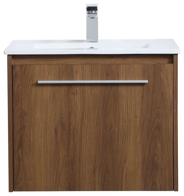 Elegant Decor VF45024WB 24 inch Single Bathroom Floating Vanity in Walnut BrownEnjoy the minimalistic style of this 24″ floating vanity in a walnut brown finish. The entire front face pulls out to reveal two smaller drawer spaces within. Topped with a sleek white countertop and an undermount sink, its urbane luxe style will be welcomed by all. The perfect vanity to help expand your bathroom space, you’ll always appreciate its presence. Style: ModernCollection: TessaFinish Color: WalnutBrownHardware Finish: Brushed NickelFixture Material: MDF, porcelain, metalProduct Shape: RectangleHardware Material: steelDimension(In): 18.31(W) x 19.69(H) x 24(L)Lighting Canopy: YesCabinet Base Material: MDFBase Finish: Walnut BrownCountertop Included: YESCountertop Material: PorcelainCountertop Finish: WhiteCountertop Dimension: 18.31(W) x 0.79(H) x 24(L)Sink Material: PorcelainSink Dimension(In): 16.93(W) x 7(H) x 11.02(L)Sink Mouting Type: IntegratedVanity Mouting Type: Wall-hung/floatingBacksplash Included?: noVanity Wood Type: MDFVanity Top Material: PorcelainJoiner Type: Cam-lockDrawer Railing: MetalVanity Drawer Dimension(In): 22.2(W) x 17.52(H) x 14.37(L)Drawer Handle Designs: Bar pullsDrawer Interior Finish: Walnut BrownDrawers Interior Dimension(In): 21.65(W) x 5.51(H) x 13.78(L)Door Included: NO