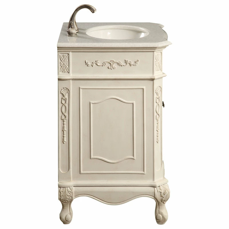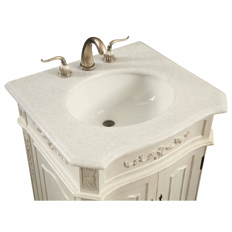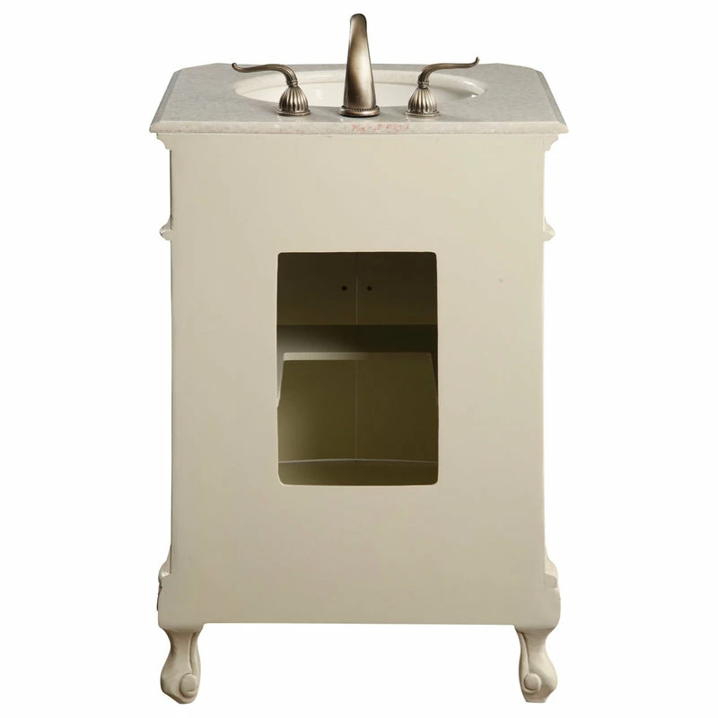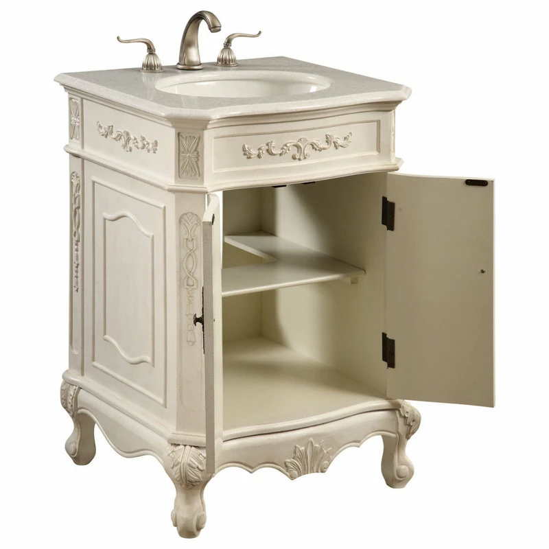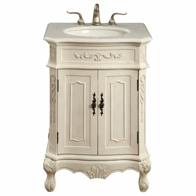 Danville 24″ Wide Vanity SetThe Danville collection is finely hand crafted vanities and matching mirrors. The vanity is a single porcelain under mount sink with marbled top and cabinet with a modest storage area Expert workmanship is evident in the detailed etchings from top to bottom. Available in your choice of antique white, antique beige, white or brown. Faucet and drain not included. Features