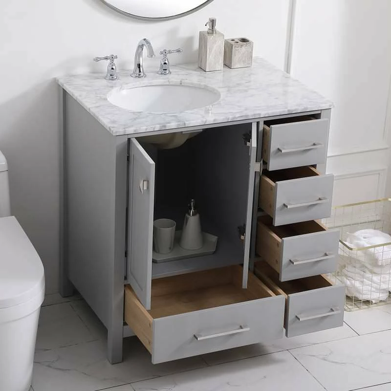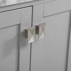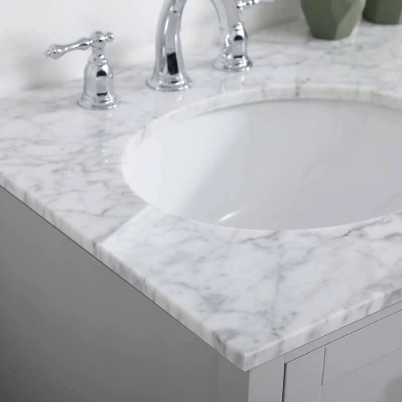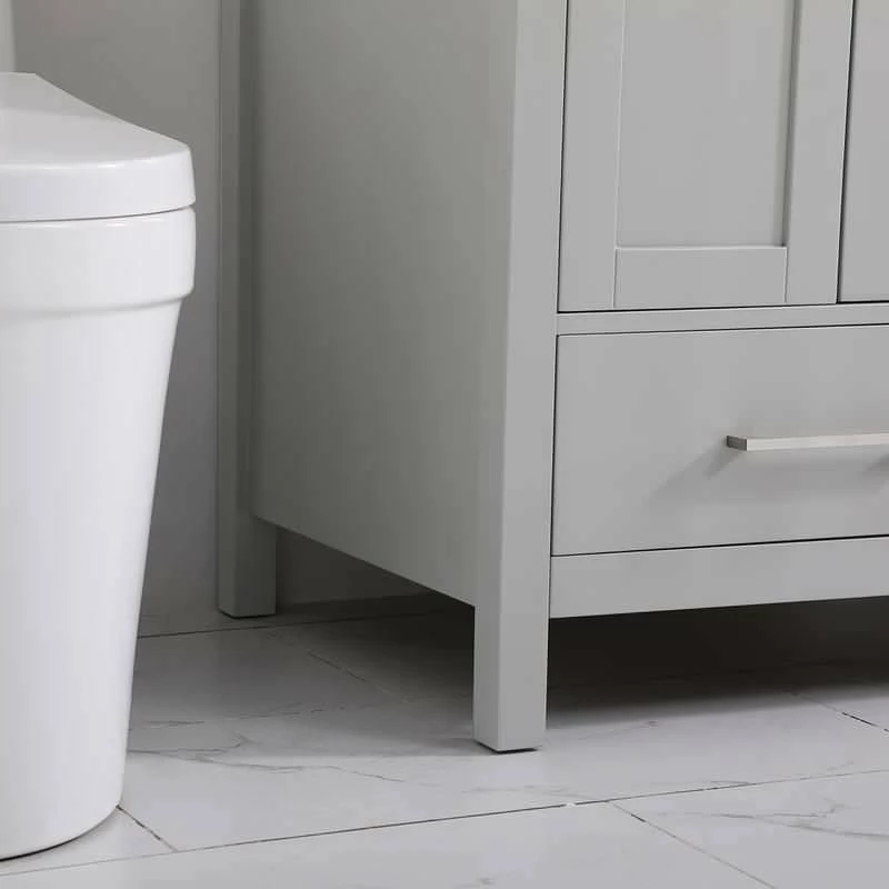Never compromise beauty–the Erina collection stunning vanity in a gray finish will add lovely sophistication and complement any bathroom or powder room, while utilizing its charm and function to provide you with ample storage spaces. Brushed nickel pulls gently adorn the minimalist cabinet doors and drawers at the base, allowing for you to store away your bathroom essentials. The Carrara white marble countertop, porcelain undermount sink, dignified subtle engravings on the side edges, and squared legs all come together to create contemporary beauty. Work with your space, and design a beautiful room, no matter the size.
