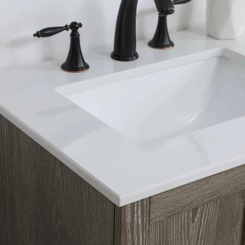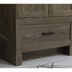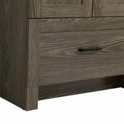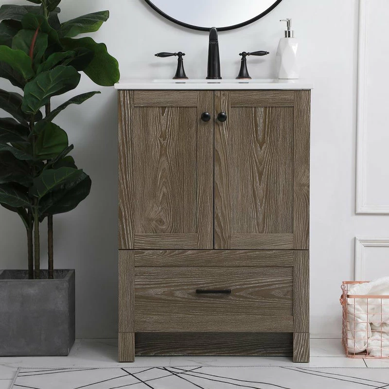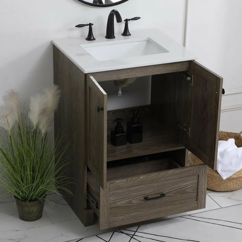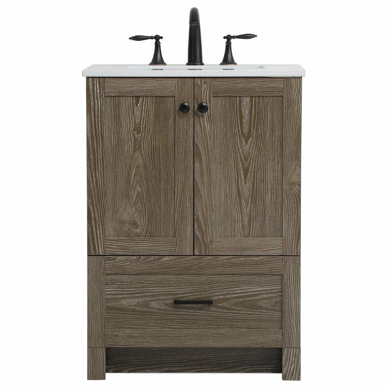 Delve into a world of minimalistic fashion and contemporary styling with this farmhouse 24″ vanity. The clean faux lines anchors the weathered design. Black handle adorns the two doors hiding the base of the integrated porcelain sink while the bottom drawer allows you to store your bathroom necessities and toiletries. The compact size makes it the perfect vanity for any bathroom or powder room, regardless of size.