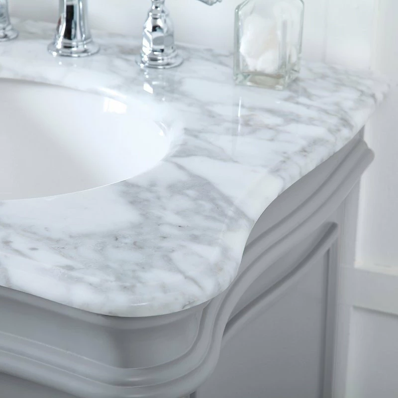 The vanity cabinet is a monochrome piece that will give a minimalistic and clean finish in your bathroom. The gray color is simple but refreshing to the eyes. To add a sleek touch, the silver accents from the knobs compliments the gray cabinets. The countertop is Carrara white marble, which incorporates both the gray and silver colors that is seamless and luxurious. Underneath the countertop are the doors to storage area where you can store away items and close off to have that minimal look.