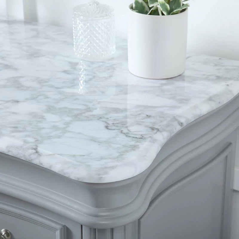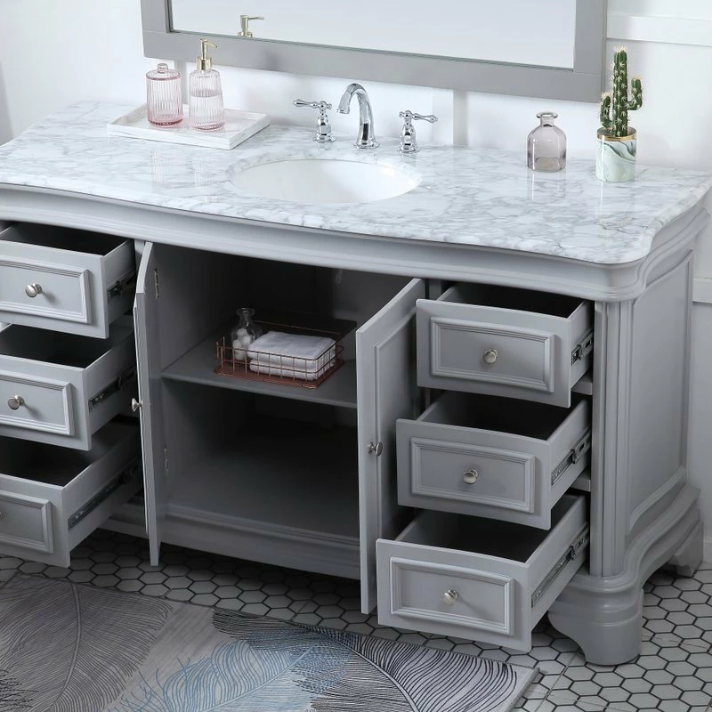 The vanity cabinet is a monochrome piece that will give a minimalistic and clean finish in your bathroom. The gray color is simple but refreshing to the eyes. To add a sleek touch, the silver accents from the knobs compliments the gray cabinets. The countertop is Carrara white marble, which incorporates both the gray and silver colors that is seamless and luxurious. Underneath the countertop are the doors to storage area where you can store away items and close off to have that minimal look.