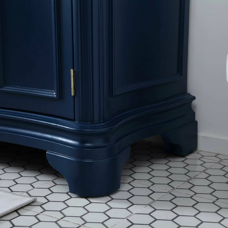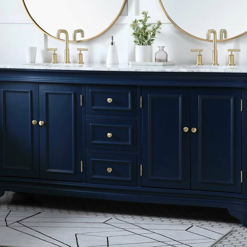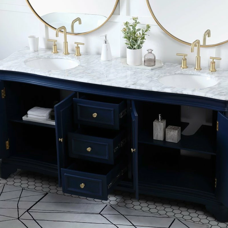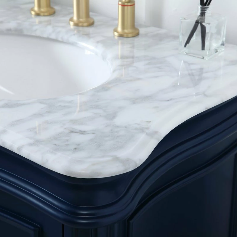 The vanity cabinet is a monochrome piece that will give a minimalistic and clean finish in your bathroom. The blue color is simple but refreshing to the eyes. To add a sleek touch, the gold accents from the knobs compliments the blue cabinets. The countertop is Carrara white marble, which incorporates both the blue and gold colors that is seamless and luxurious. Underneath the countertop are the doors to storage area where you can store away items and close off to have that minimal look.