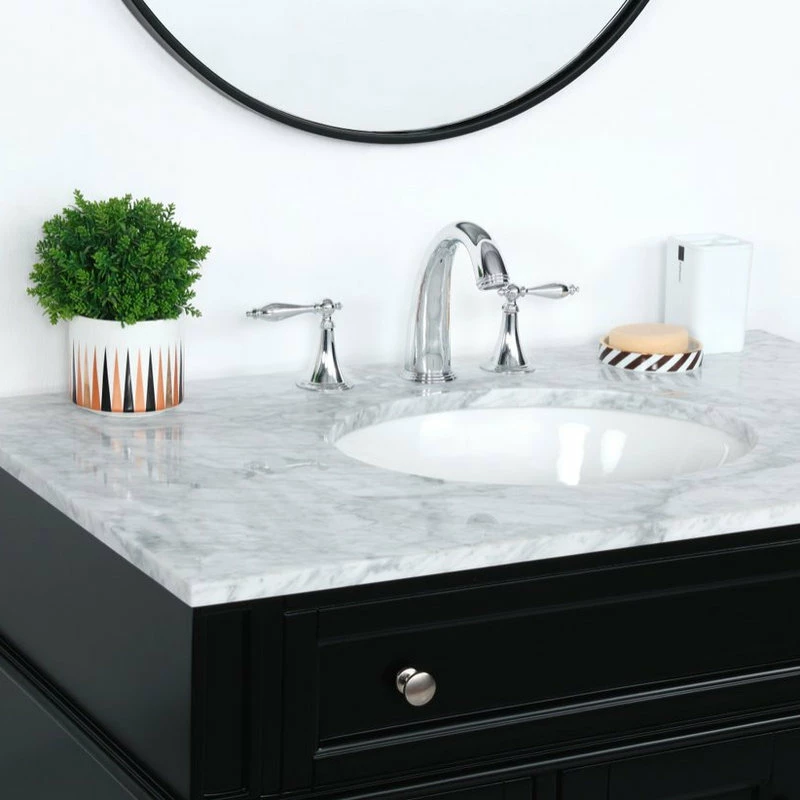Modern sophistication is defined within the black finish and brushed nickel kNobs of this compact vanity. Its modest length makes it the perfect addition to any sized home, and saves space with its storage area hidden behind the double cabinet doors. Topped with a Carrara white marble counter top and a porcelain sink, this design will add everlasting class to your bathroom and powder room.