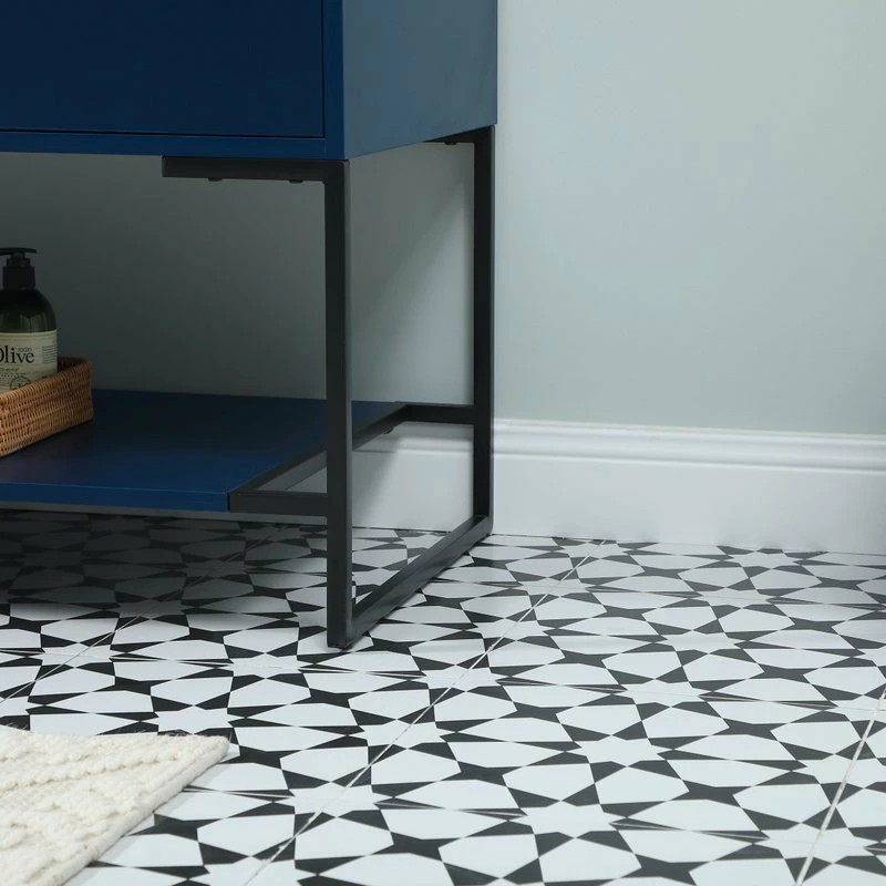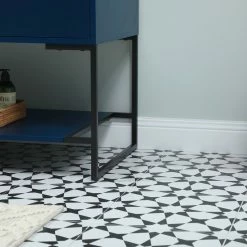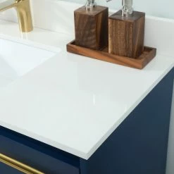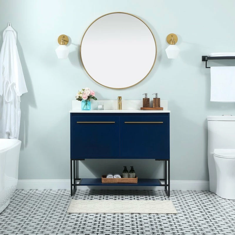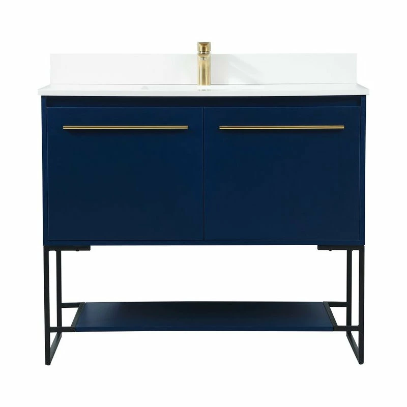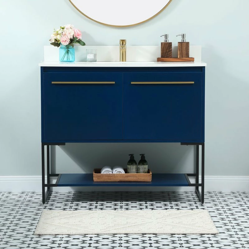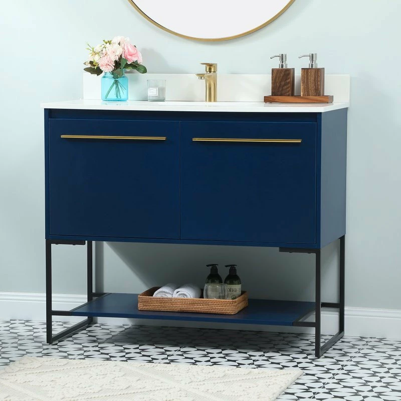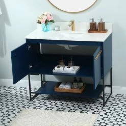 Live in modern comfort with this 36″ blue finish vanity. Dressed in a blue and sleek gold metal hardware, its contemporary style will have your bathroom or powder room elevated in industrial sophistication. The open shelf at the base and two doors reveal ample storage space for your bathroom essentials and miscellany. Clean lines create its own visual interest, adding trendy looks to your already chic room. Comes with a matching backsplash to complete the look and protects your wall.