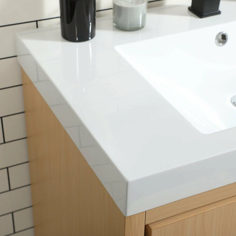 Modern sophistication is defined within the maple finish and black barpulls of this vanity. Its length makes it the perfect addition to any sized home, and saves space with its storage area hidden behind the double cabinet doors and one bottom drawers. Topped with a highly durable resin white counter top and an integrated sink, this modern design will add everlasting class to your bathroom and powder room.