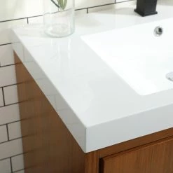 Modern sophistication is defined within the teak finish and black barpulls of this vanity. Its length makes it the perfect addition to any sized home, and saves space with its storage area hidden behind the double cabinet doors and one bottom drawers. Topped with a highly durable resin white counter top and an integrated sink, this modern design will add everlasting class to your bathroom and powder room.