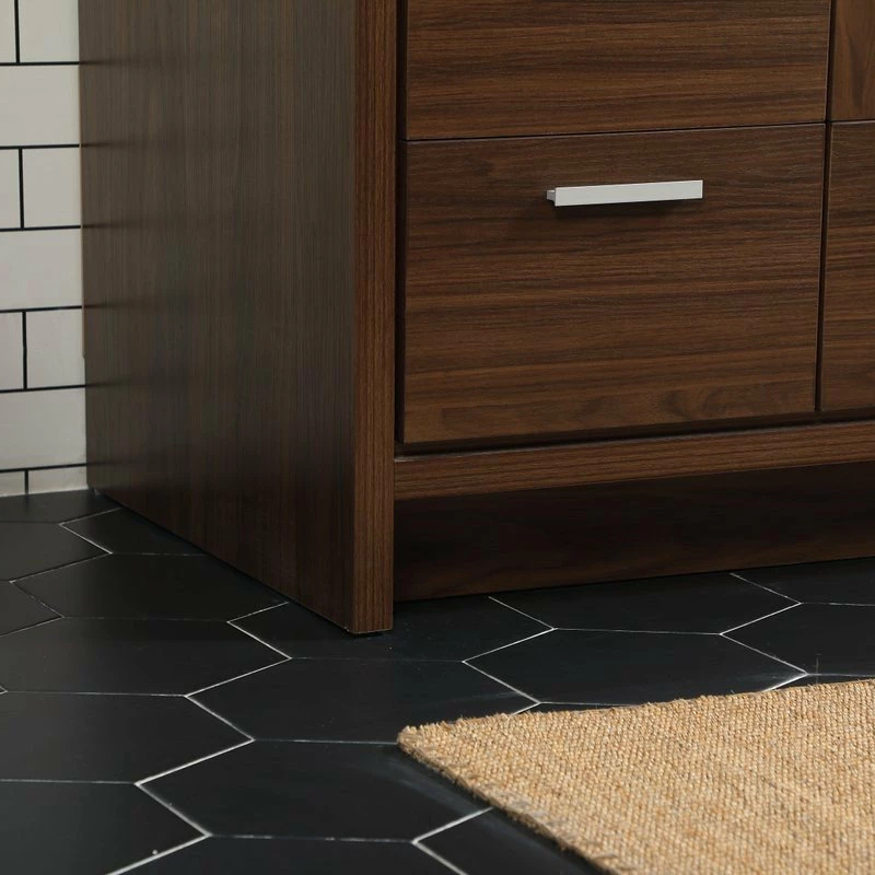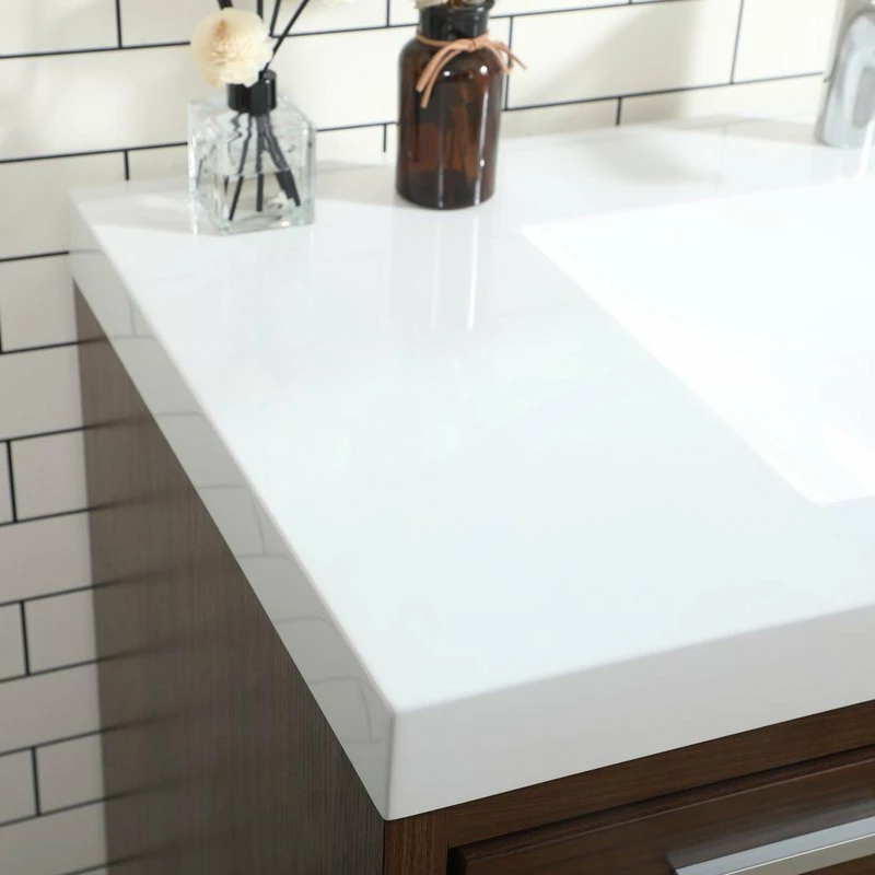 Modern sophistication is defined within the walnut finish and silver barpulls of this vanity. Its length makes it the perfect addition to any sized home, and saves space with its storage area hidden behind the double cabinet doors and one bottom drawers. Topped with a highly durable resin white counter top and an integrated sink, this modern design will add everlasting class to your bathroom and powder room.