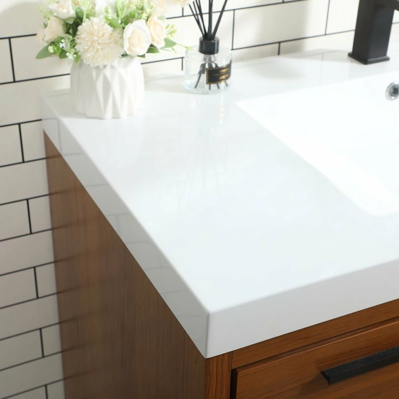 Modern sophistication is defined within the teak finish and black barpulls of this vanity. Its length makes it the perfect addition to any sized home, and saves space with its storage area hidden behind the double cabinet doors and one bottom drawers. Topped with a highly durable resin white counter top and an integrated sink, this modern design will add everlasting class to your bathroom and powder room.