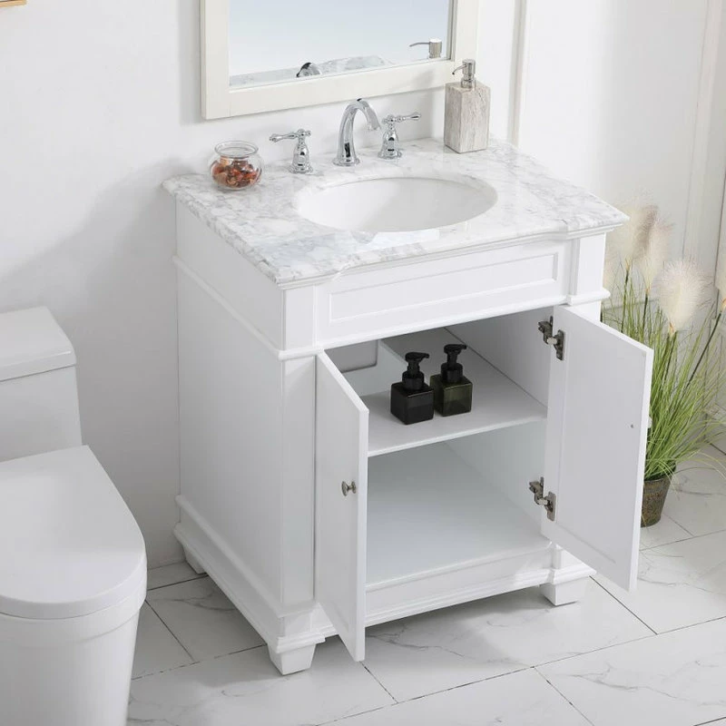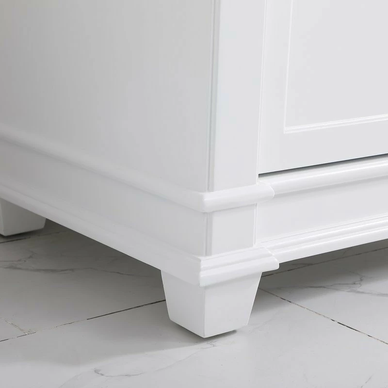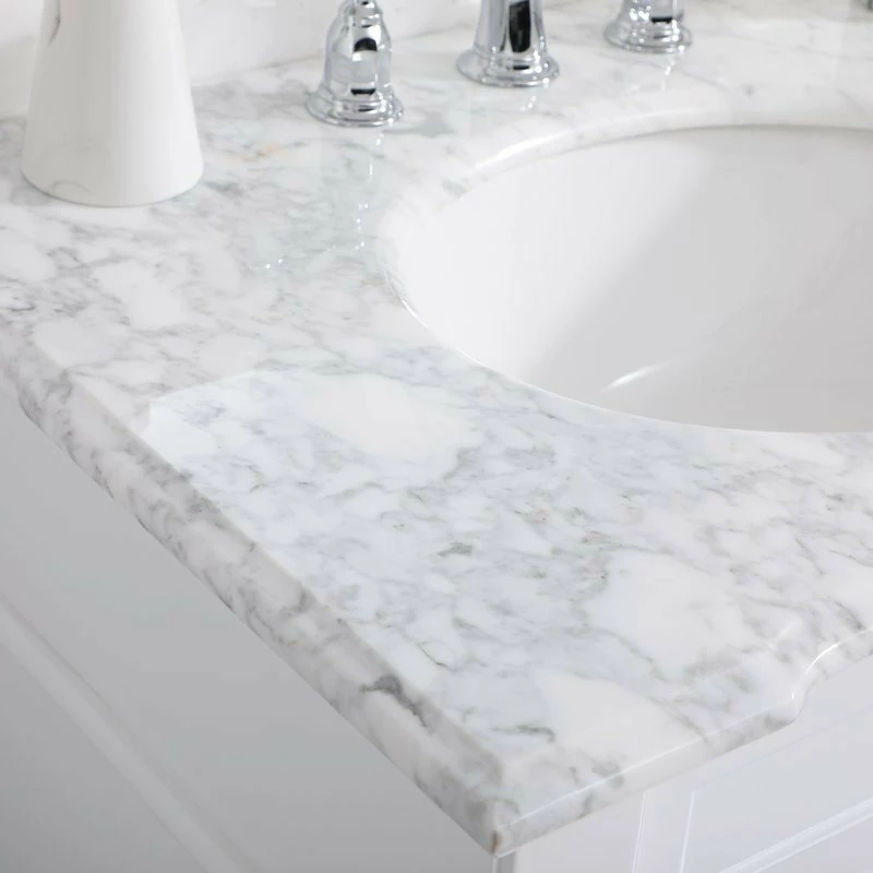 The vanity cabinet will bring a settle pop of color into your bathroom. The white finish is a sophisticated color which creates a calming atmosphere in the room. The brushed nickel knobs bring a vibrant touch to balance the vanity. With the detailed engravings, the cabinet catches eyes with its beautiful lining work. Open the cabinet doors to store what you desire and make use of the spacious area. To top it off, the Carrara white marble adds a luxury and modern finish to the countertop.