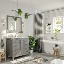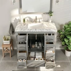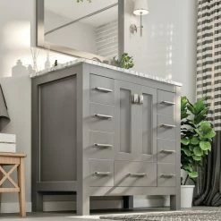The Eviva Hampton is a 36 inch bathroom vanity with more storage than any other 36 inch vanity on the market. Featuring 9 soft closing dovetail drawers and 2 doors, solid wood construction, white Carrara marble countertop with pre-drilled 3-Hole 8″ widespread faucet mount and brushed chrome handles/knobs. Available in White, Gray or Espresso.