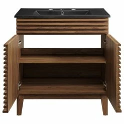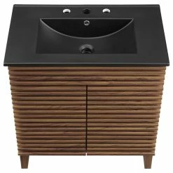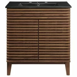Tap into mid-century aesthetics with the Render Vanity. Render Bathroom Vanity features a durable particleboard frame with smooth laminate, four tapered wood legs, and adjustable storage shelf behind two soft-close hinged doors. A curved ceramic basin and integrated countertop with three faucet holes create sleek lines and crisp design for an edgy style designed to meet your needs. Boasting a mid-century modern style this vanity features a solid construction with a pleasing look and practical functionality. 8″ centerset faucet holes. Assembly required and fixtures not included.
